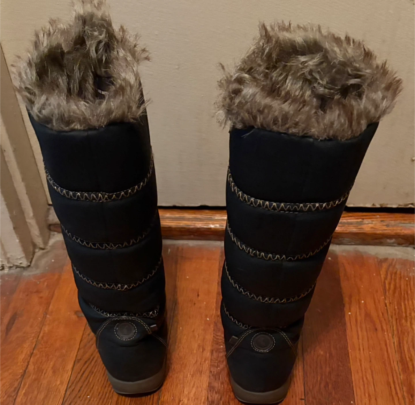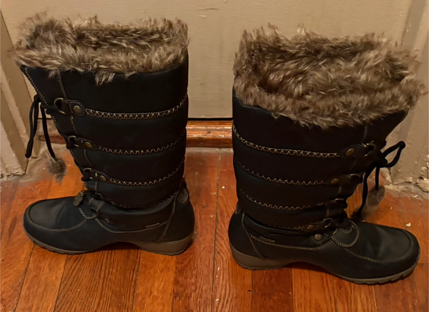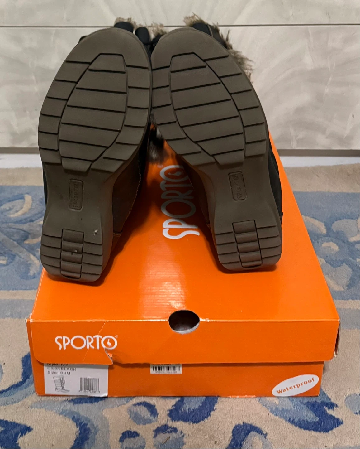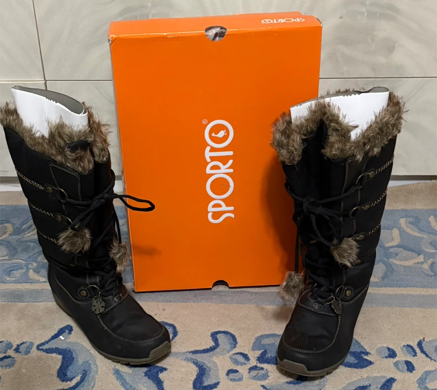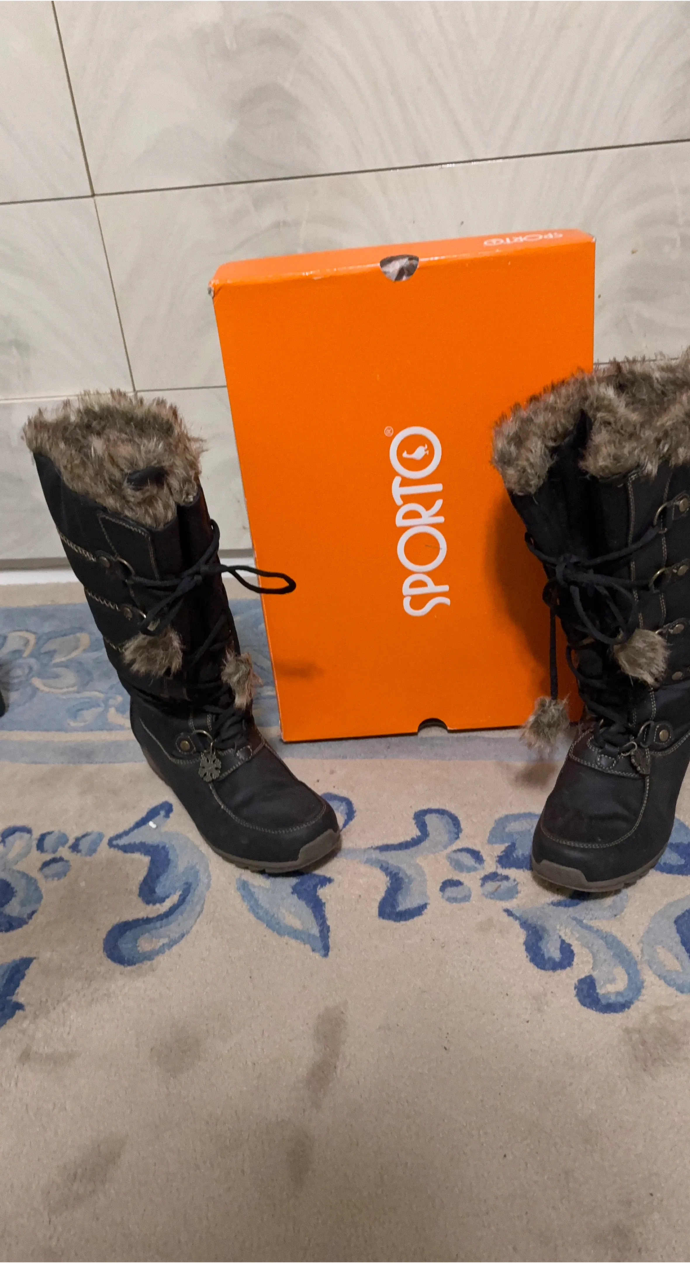 Sporto winter boots in black with faux fur trim & lining. These boots are waterproof and come with the original box. They feature a lace-up front and a sturdy sole.