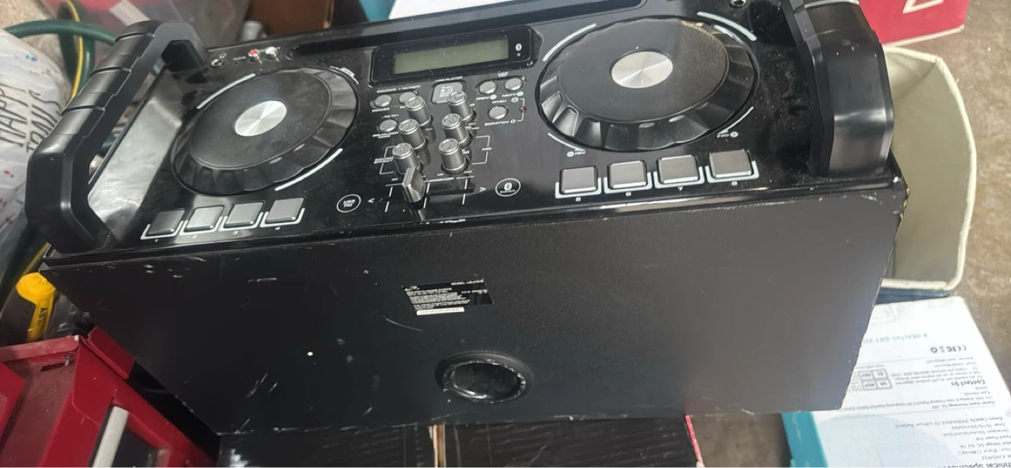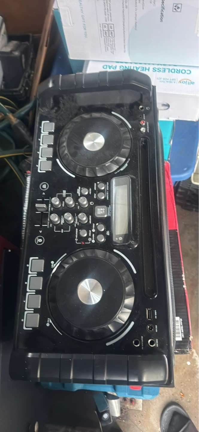 This LIVE brand DJ controller speaker system features two turntables, a mixer section, and large front-facing speakers. It's a portable unit designed for parties or practicing DJ sets. The unit appears to have USB and aux inputs.