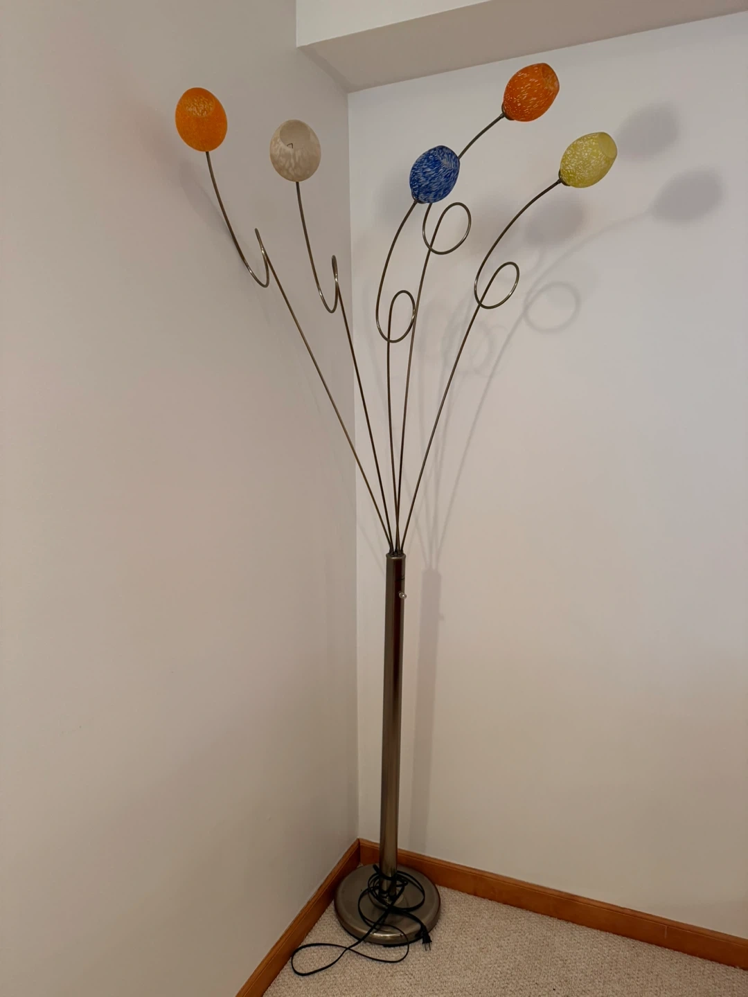 This floor lamp has a modern design with a brushed metal stand. It features five decorative glass shades in orange, cream, blue, and yellow hues. A unique addition to any room!