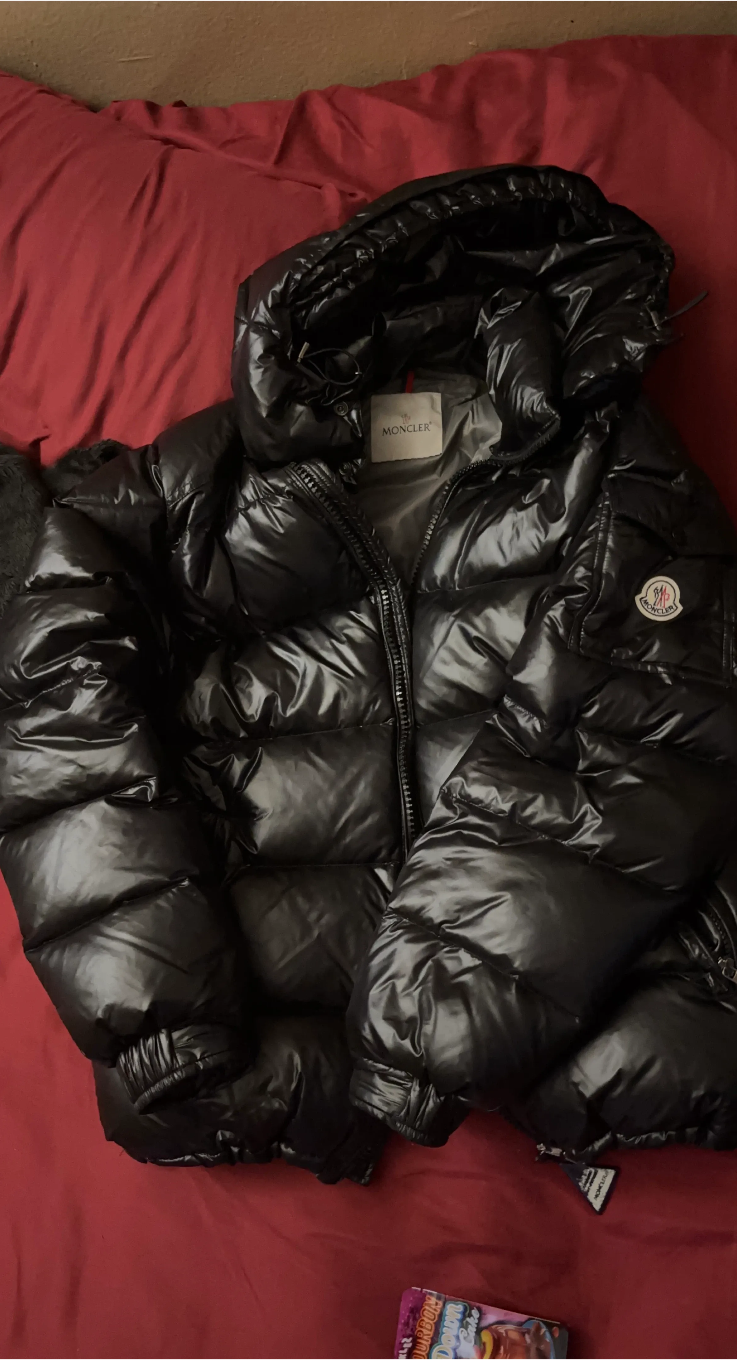 This is a shiny black puffer jacket from Moncler. It's a down-filled coat with a hooded design. This jacket is perfect for staying warm in cold weather! Authentic MONCLER valued at $2,000 new it’s a steal for next year and the mixy weather