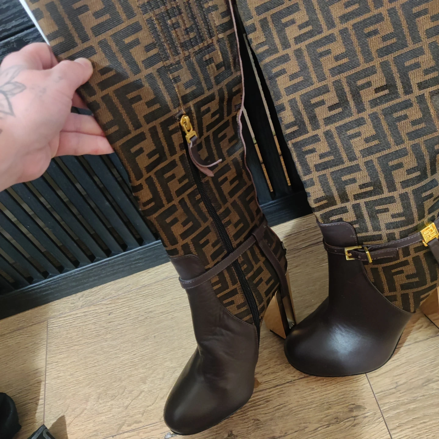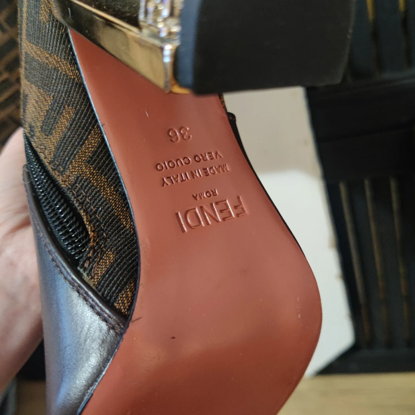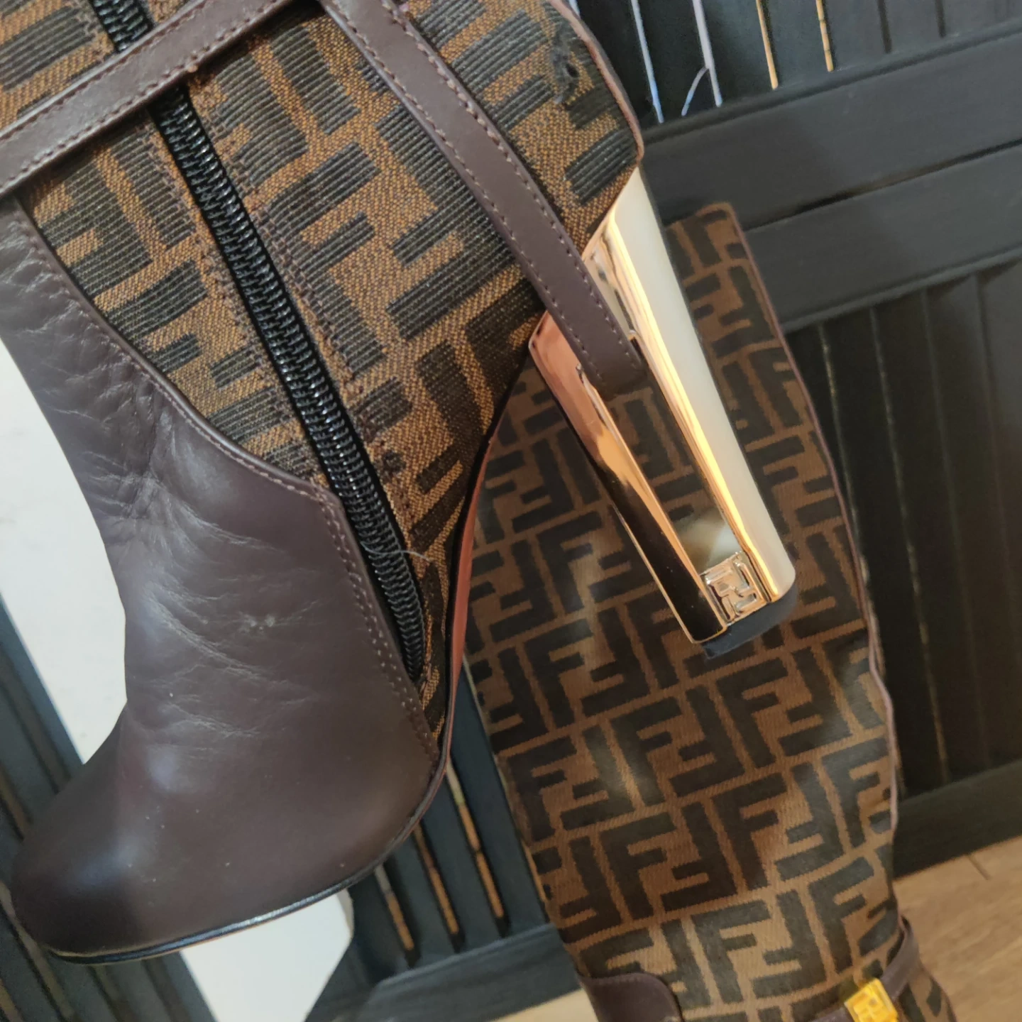 Authentic Fendi boots with the iconic Zucca pattern. Made in Italy, size 36. These boots feature a mix of canvas and leather with a stylish gold-tone heel. A side zipper ensures an easy fit.