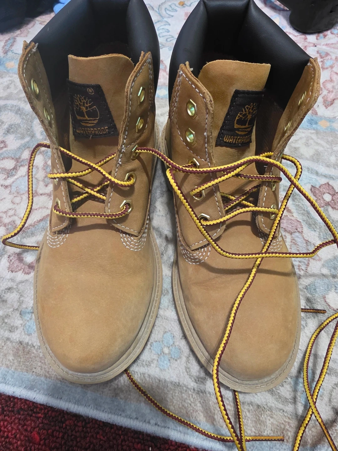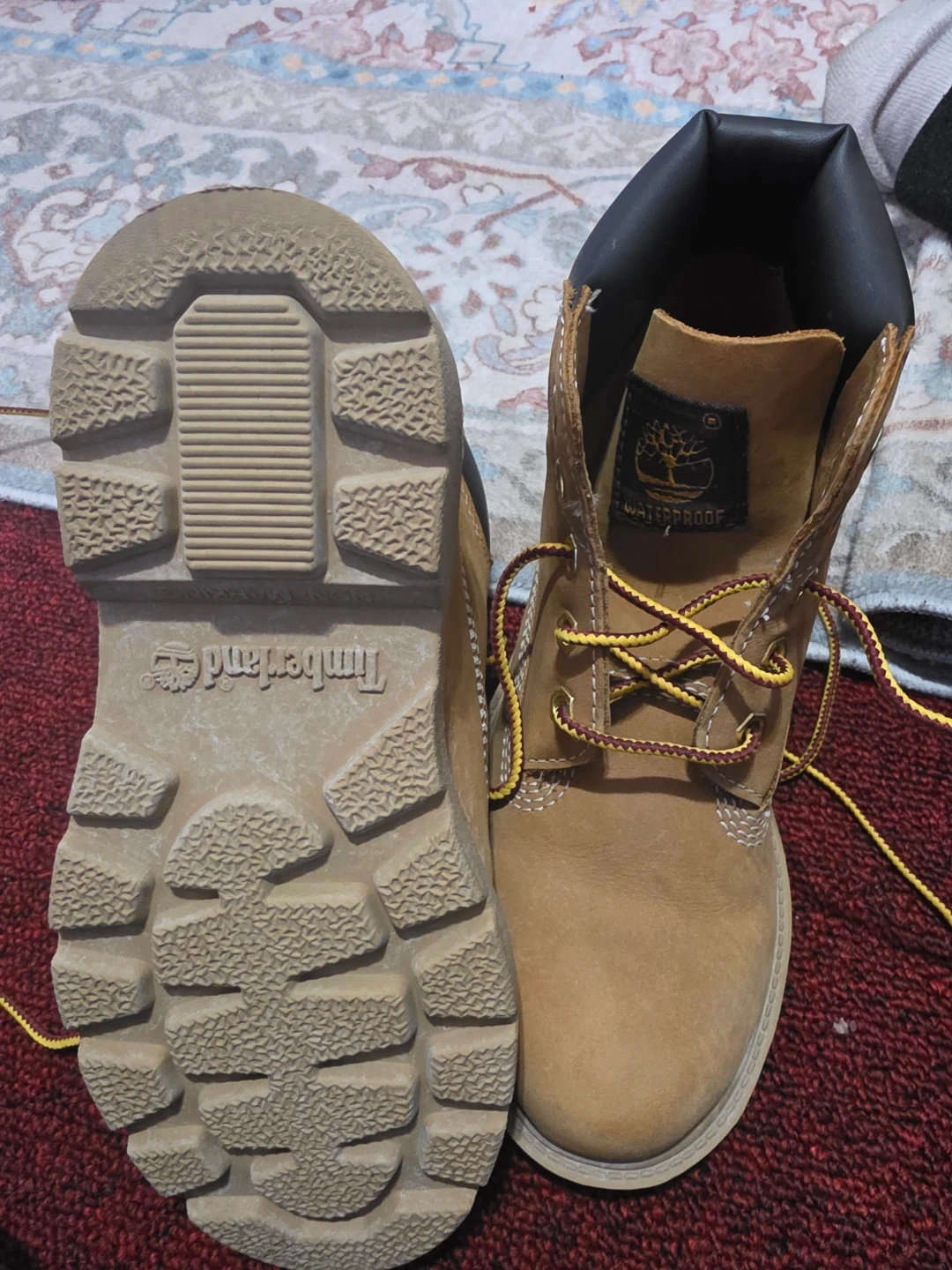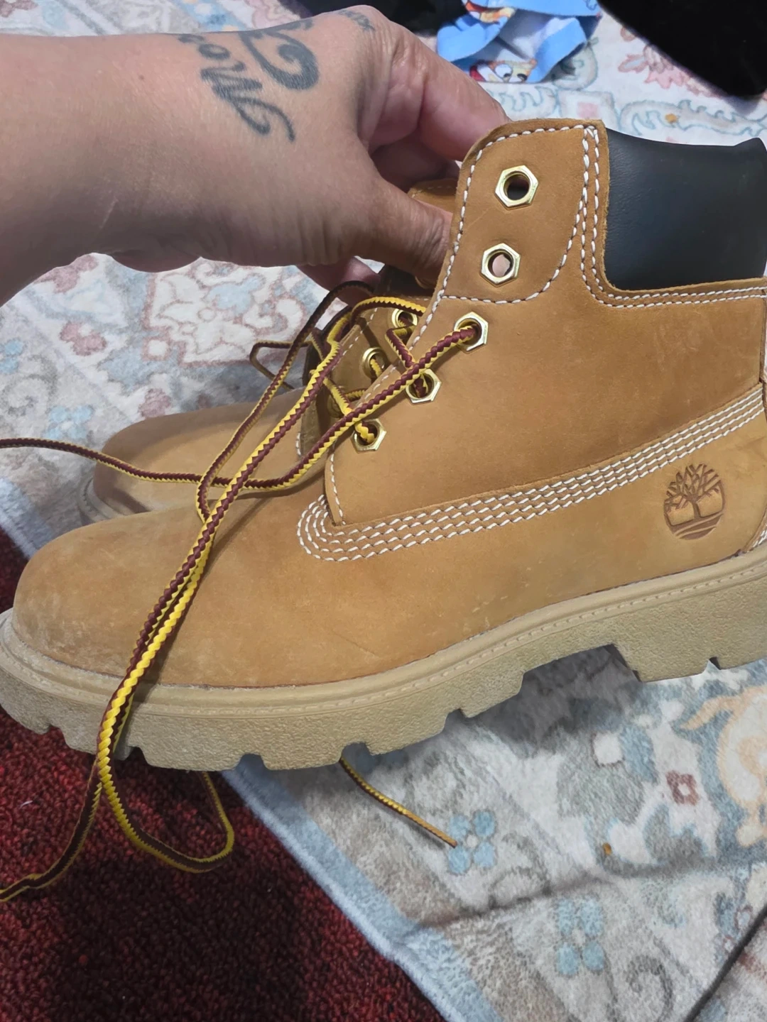 Classic tan Timberland boots. These are waterproof and feature the iconic Timberland logo. They have a sturdy sole for grip. Ready for any adventure! Size 13 kids