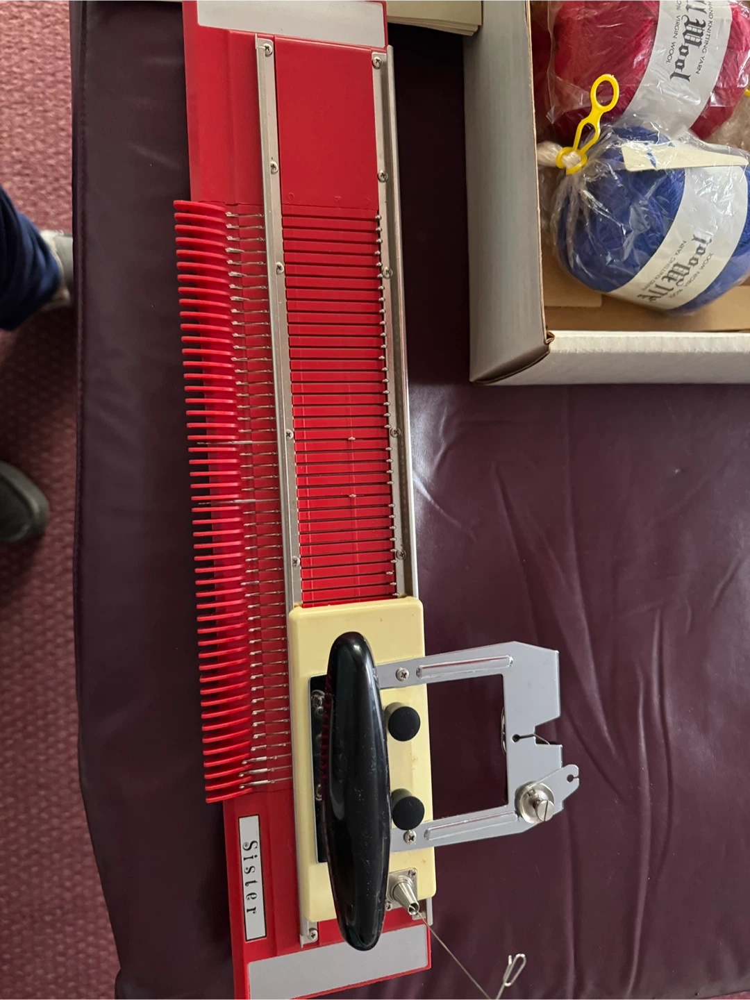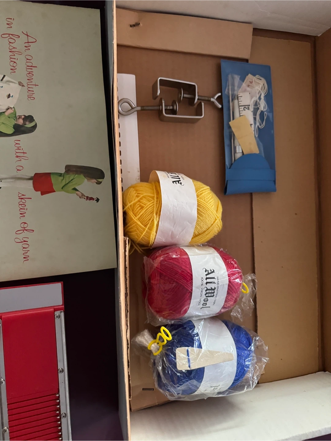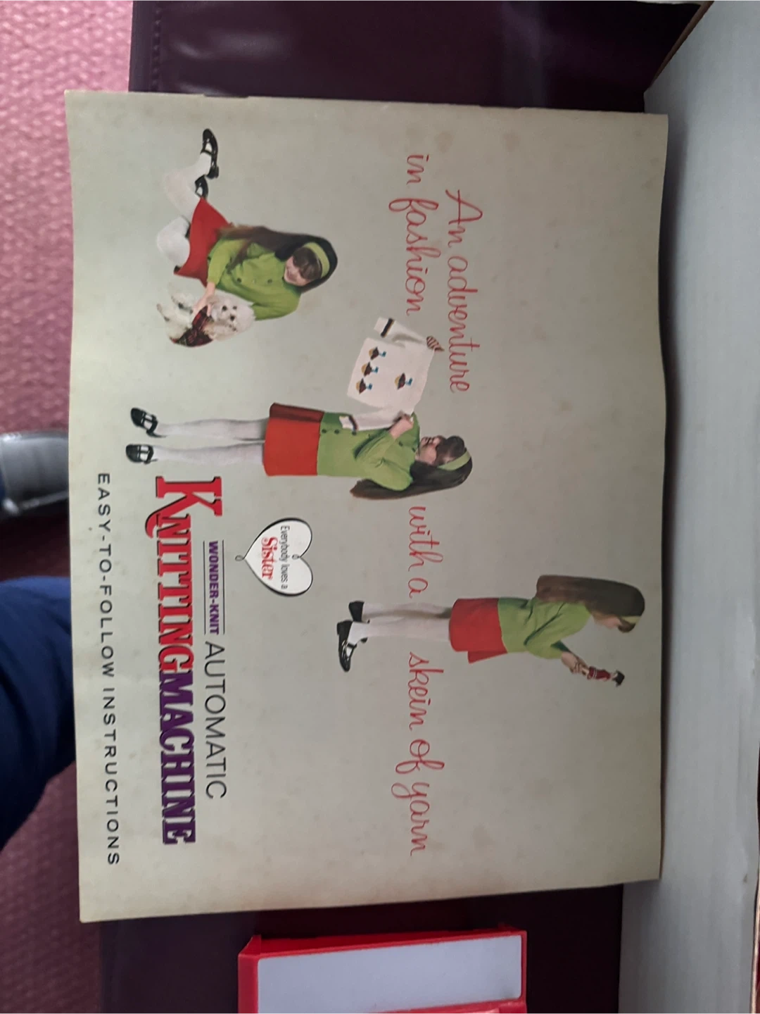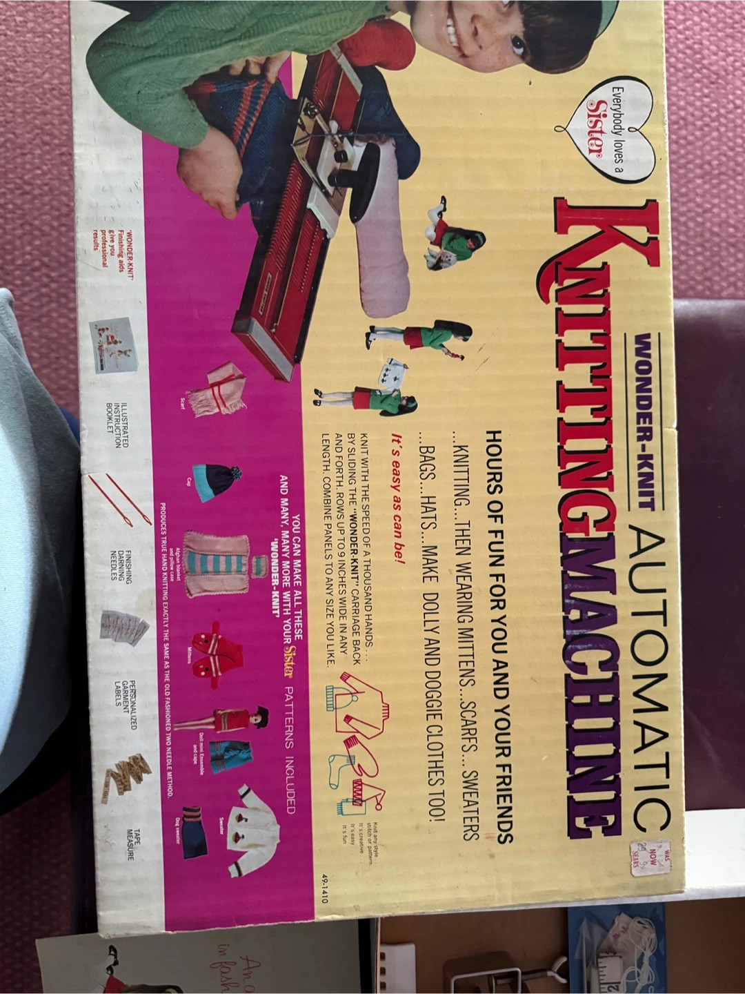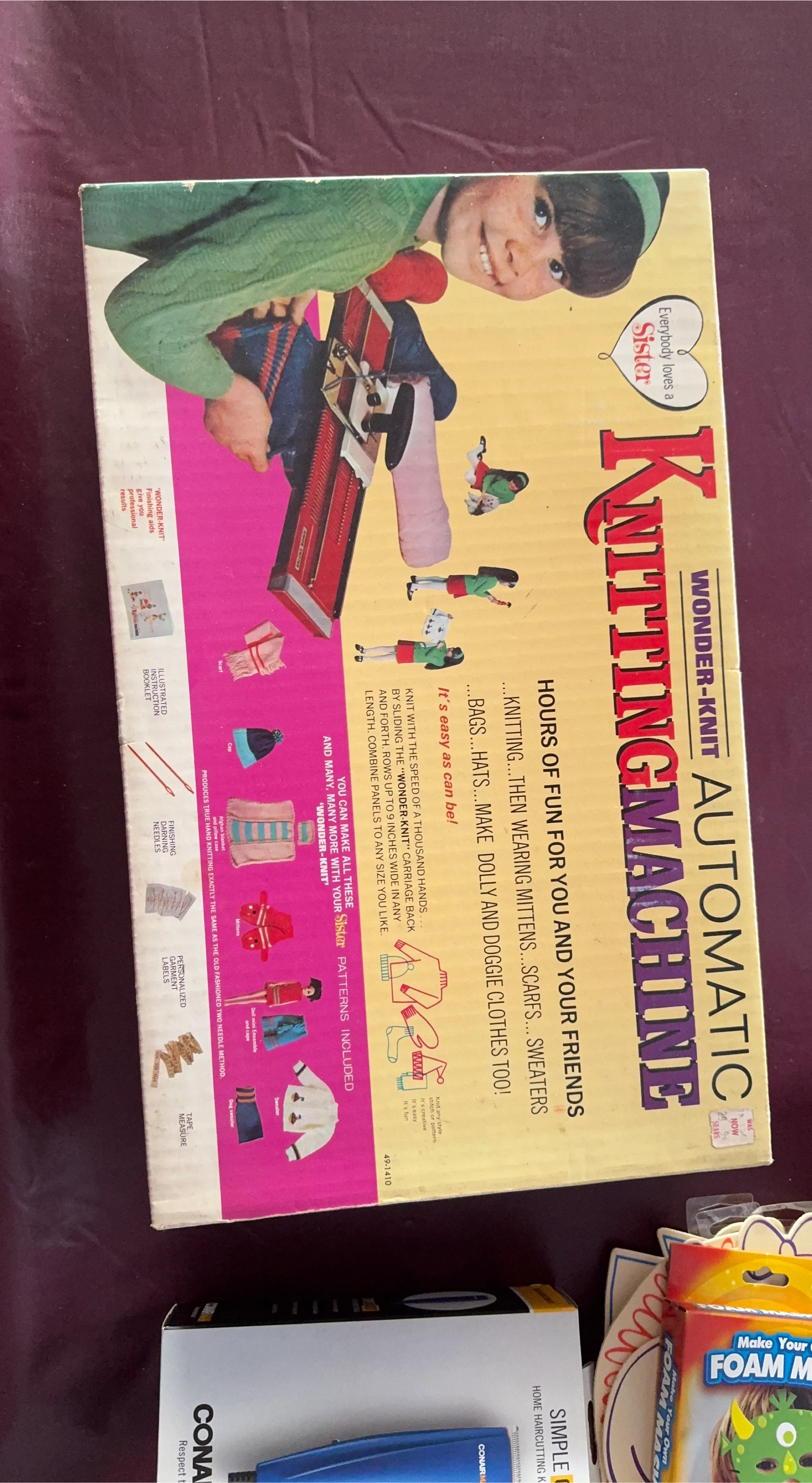 Singer Wonder-Knit Automatic Knitting Machine for hours of fun. Make bags, hats, mittens, scarves, and sweaters. Knitting with the speed of a thousand hands. Includes original box, illustrated instruction booklet, finishing needles, tape measure, personalized labels, and three balls of yarn. Makes all these patterns and many more! In original box