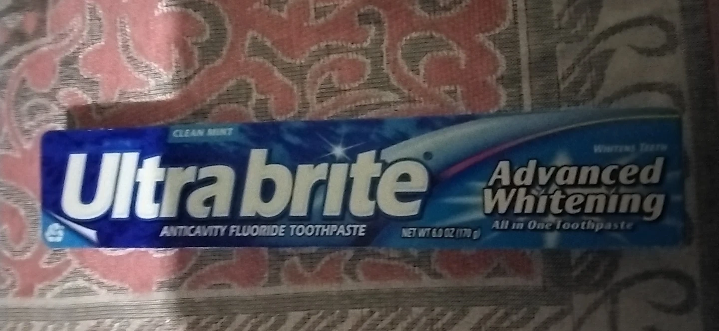 This is Ultra Brite Advanced Whitening toothpaste in Clean Mint flavor. It's an anticavity fluoride toothpaste. Net wt 6.0 oz (170 g).