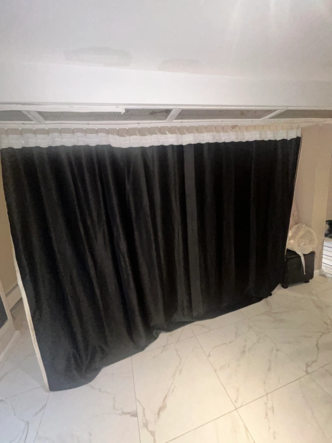 These are one large fabric curtains, one size is black and one tan. They can be used to divide a room or as window coverings. The fabric appears to be a thick, opaque material. They hang from a rod with attached loops.