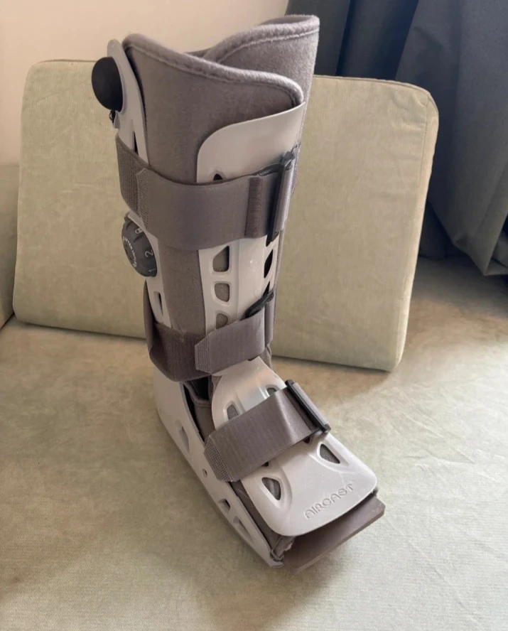 Aircast walker boot designed for supporting and protecting the ankle and foot after sprain or fractures. It has adjustable straps for a secure fit.