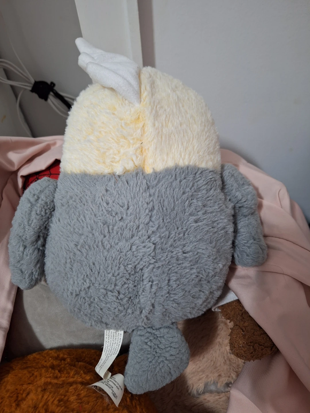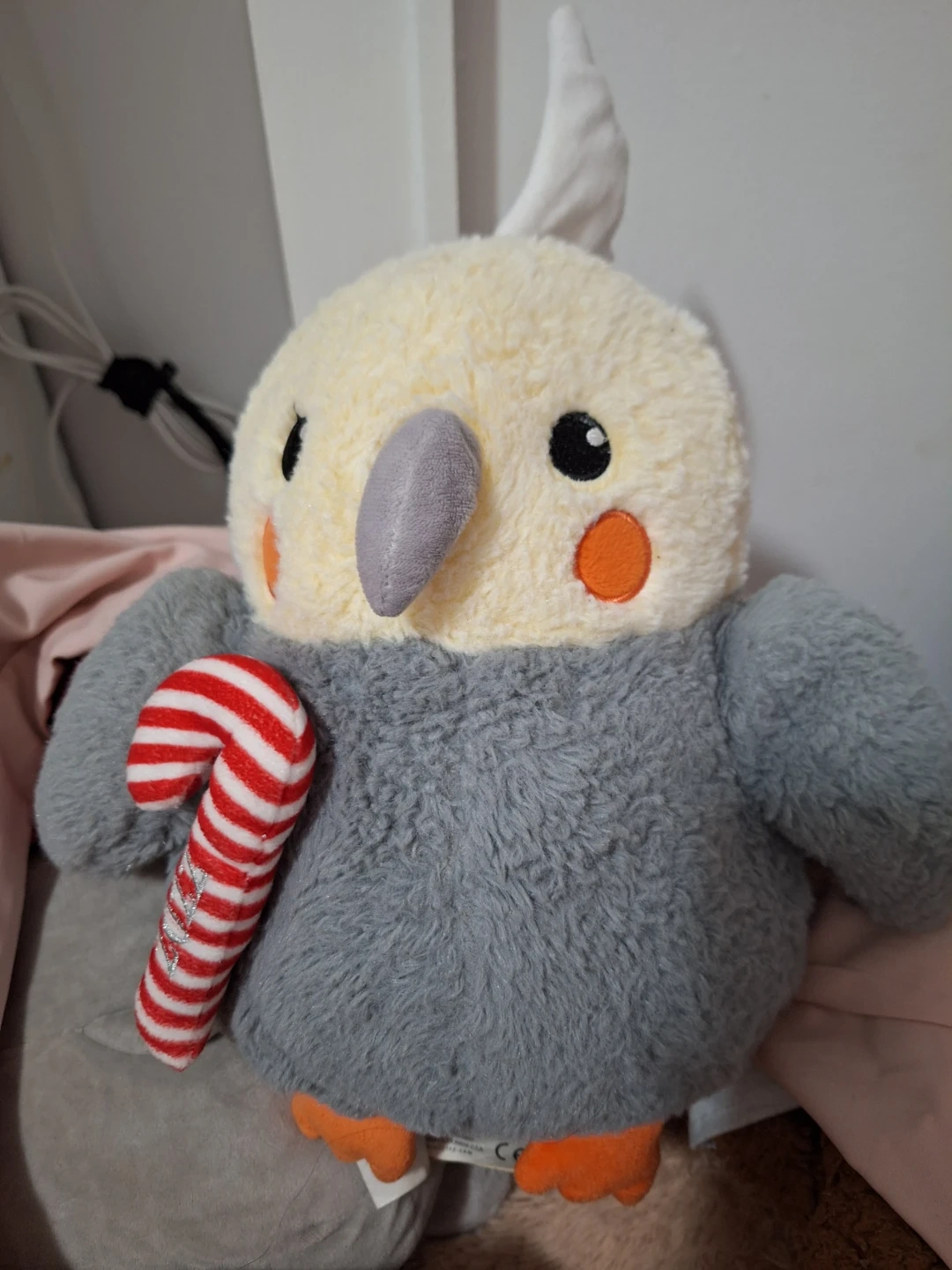 This is a cute plush toy resembling a cockatiel bird. It's holding a red and white striped candy cane accessory. Made with soft, fuzzy material for comfort.