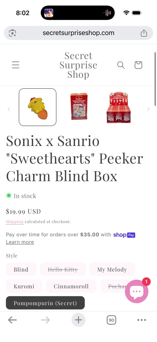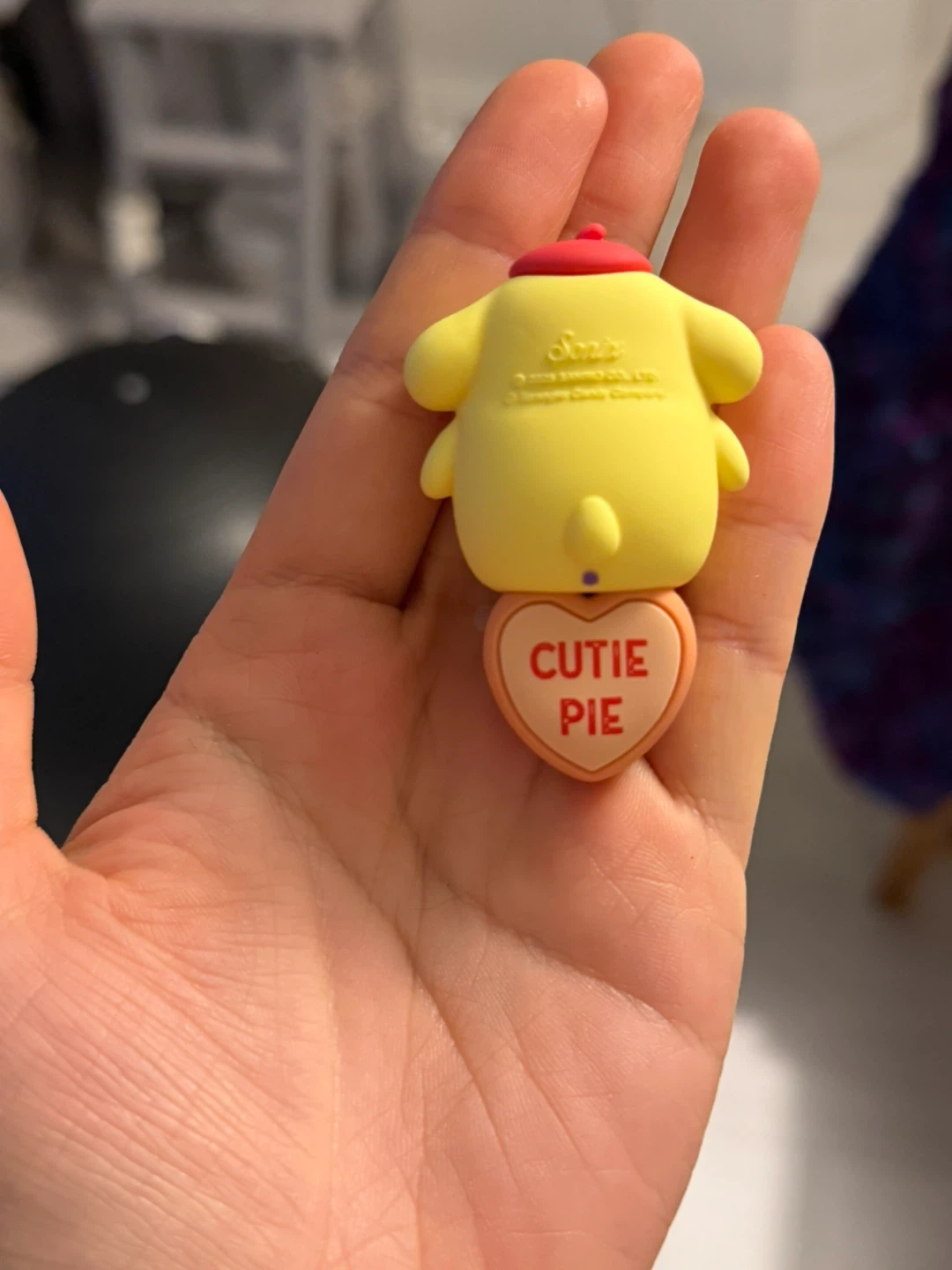 This is a Sanrio Pompompurin Sweethearts Peeker Charm. It features Pompompurin with a red hat on and a heart that says 'Cutie Pie'. (Secret!)