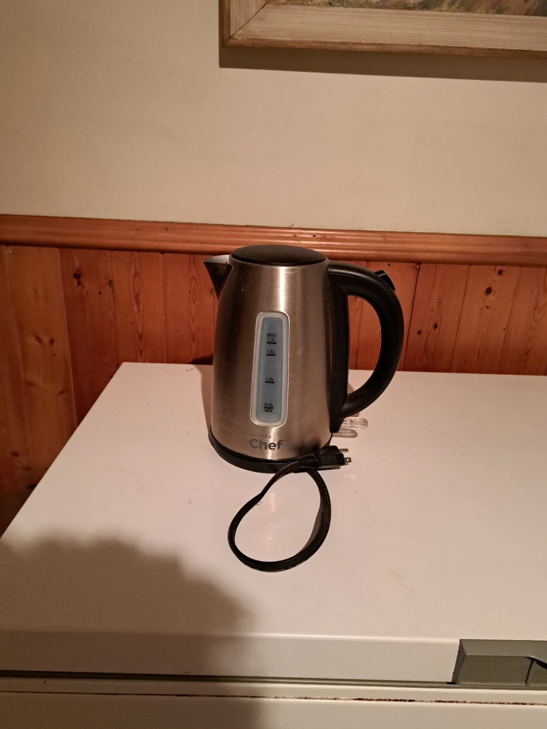 Master Chef stainless steel electric kettle. It holds up to 1.7 litres of water. The minimum fill line is 0.5L.