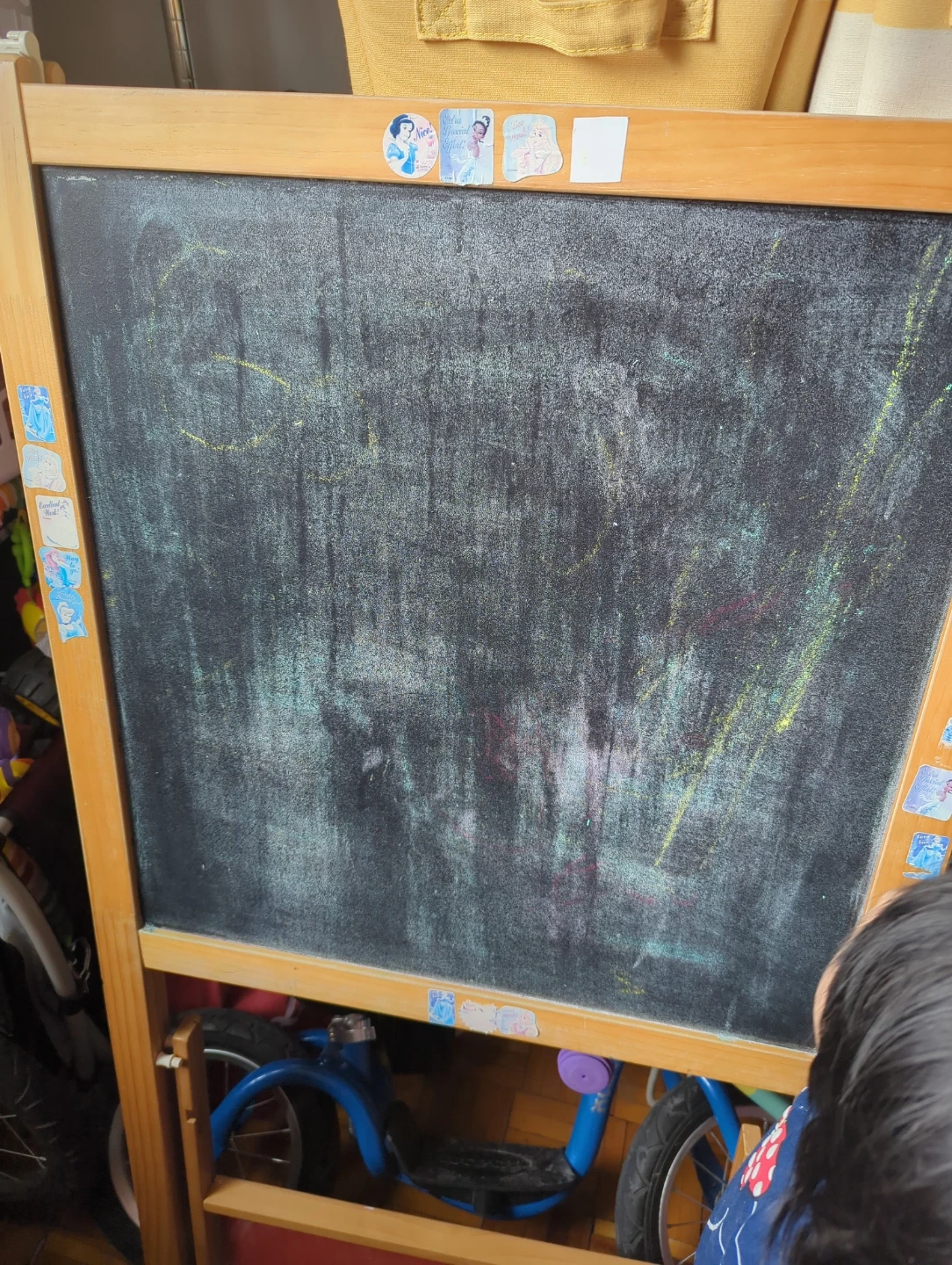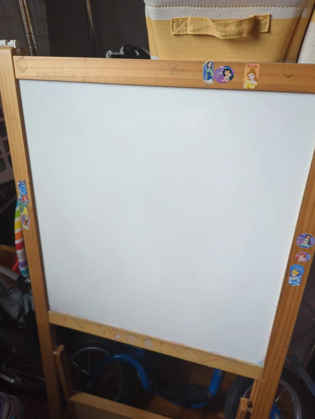 This wooden easel features a whiteboard on one side and a chalkboard on the other. It's perfect for creative kids! It has a durable wooden frame.