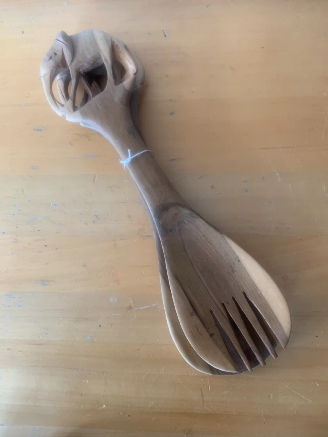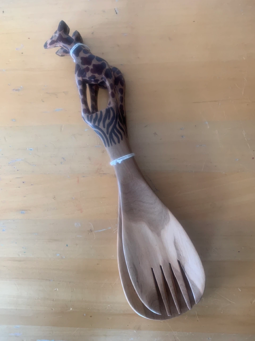Wooden salad servers, one set with giraffes and one set with elephants along with an oval bowl/tray. They're in excellent condition and would add a nice touch to your dining table or kitchen!
