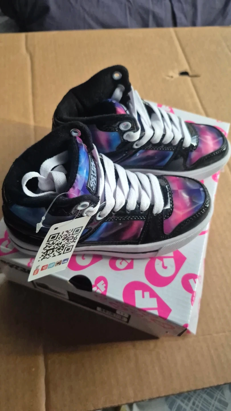 Cool high-top sneakers with a vibrant galaxy print. They feature a patent leather finish and white laces. These shoes are perfect for adding a pop of colour to any casual outfit!