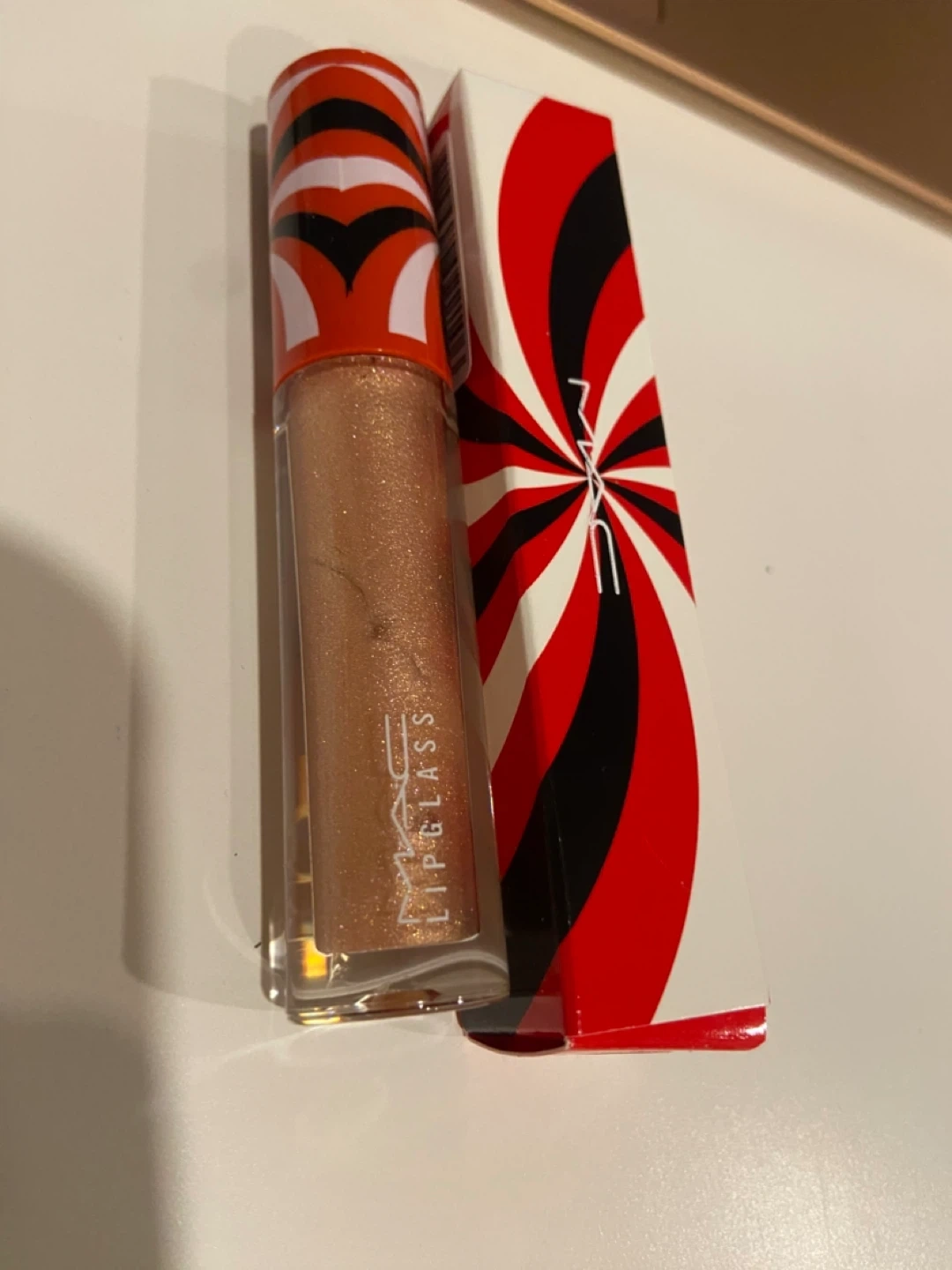 This is a MAC Lipglass Sparkle in a shimmering copper shade. It's a new, unopened product, perfect for adding a touch of shine to your lips. The formula is long-lasting and provides a beautiful, glossy finish.