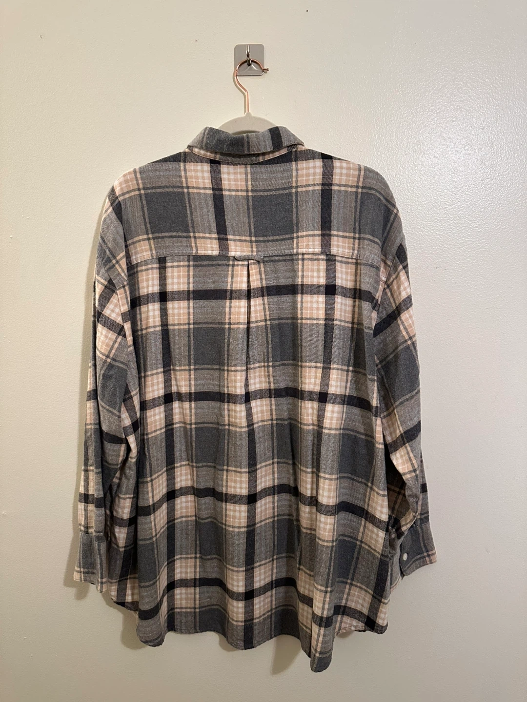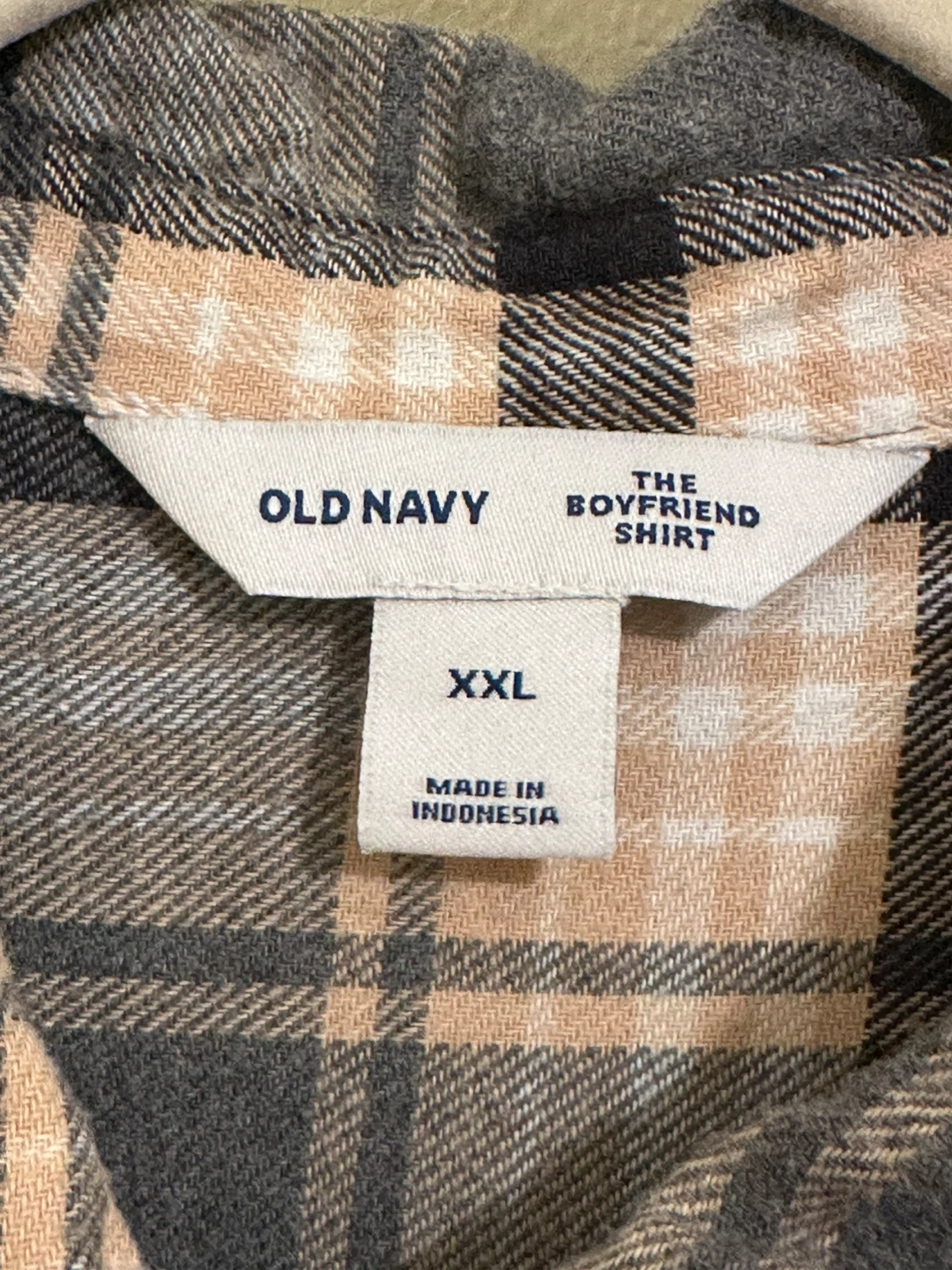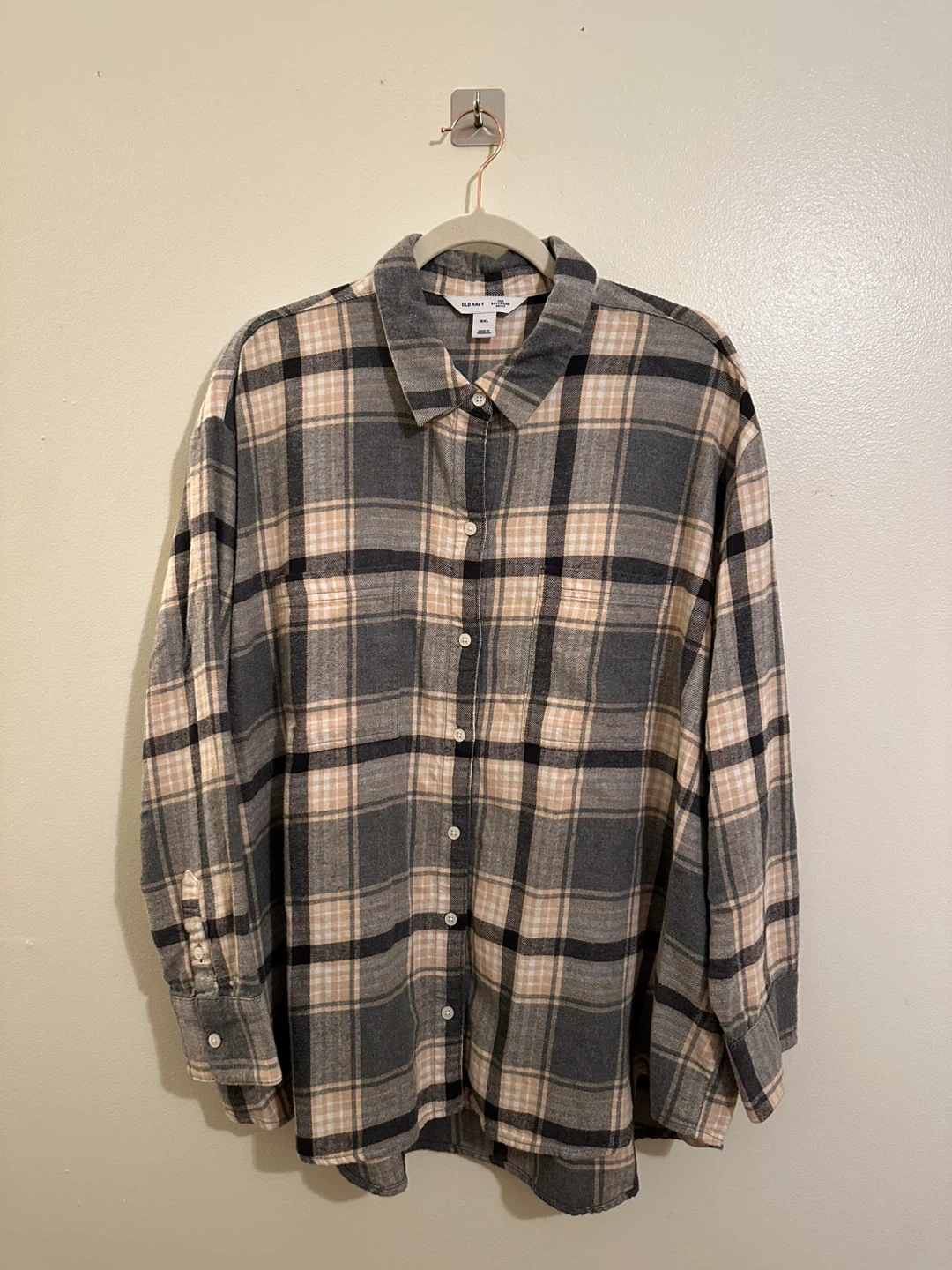 Selling a comfy Old Navy boyfriend shirt in size XXL. It's a plaid pattern with gray, black, and beige colors. 100% cotton! Perfect for layering!