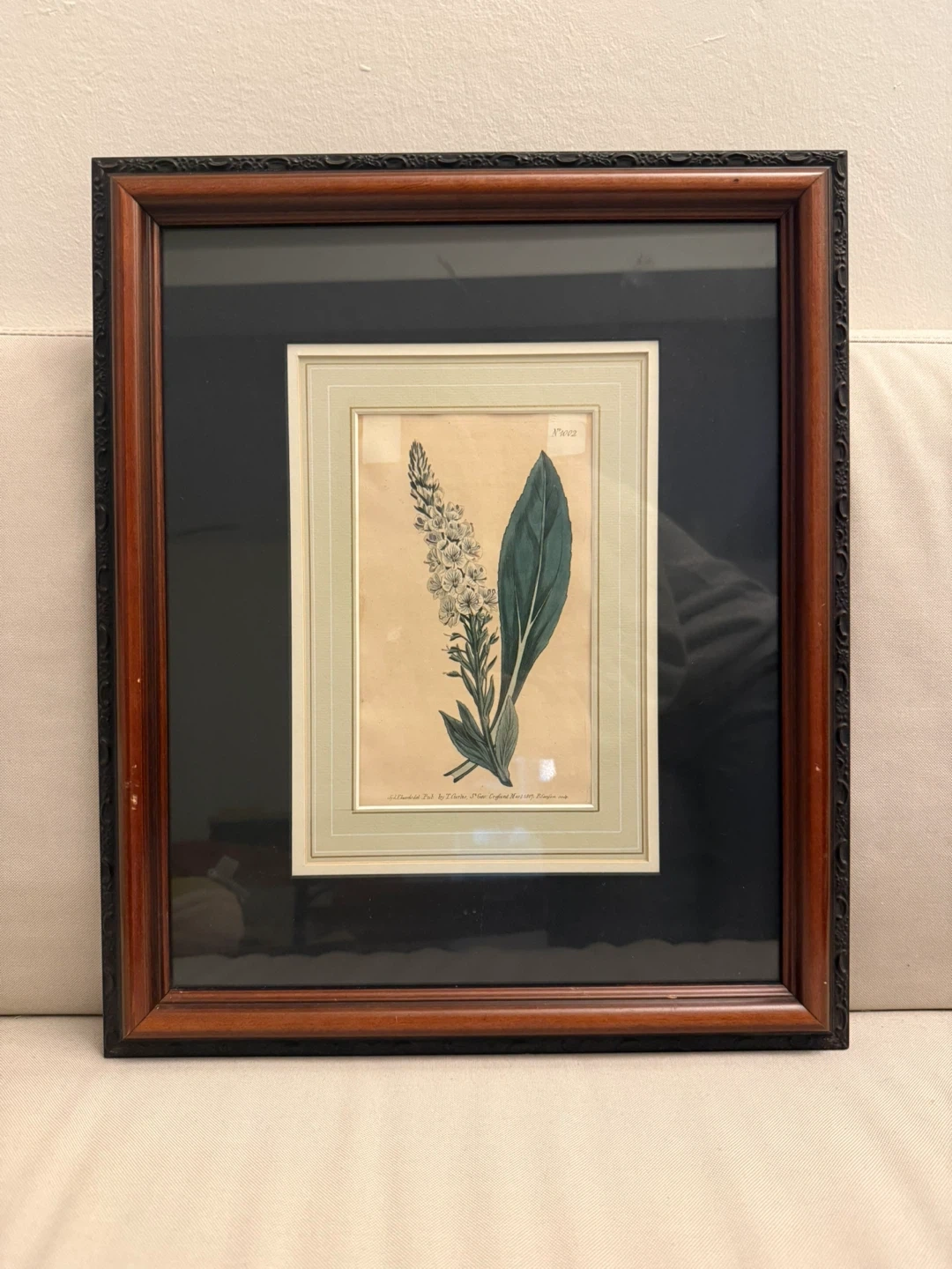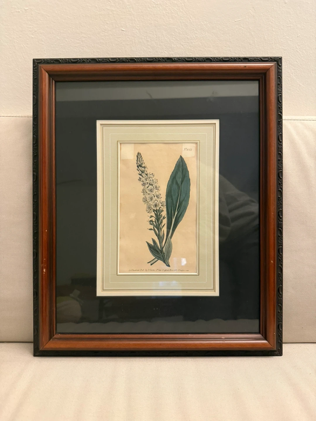 Printed edition of a botanical illustration by Sydenham Edwards from William Curtis's "Botanical Magazine" 1790-1805. Features the Veined-flowered speedwell with pale blue and white flowers. It is framed and has picture wire attached for easy display.
