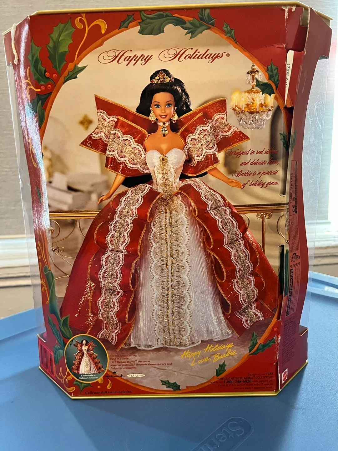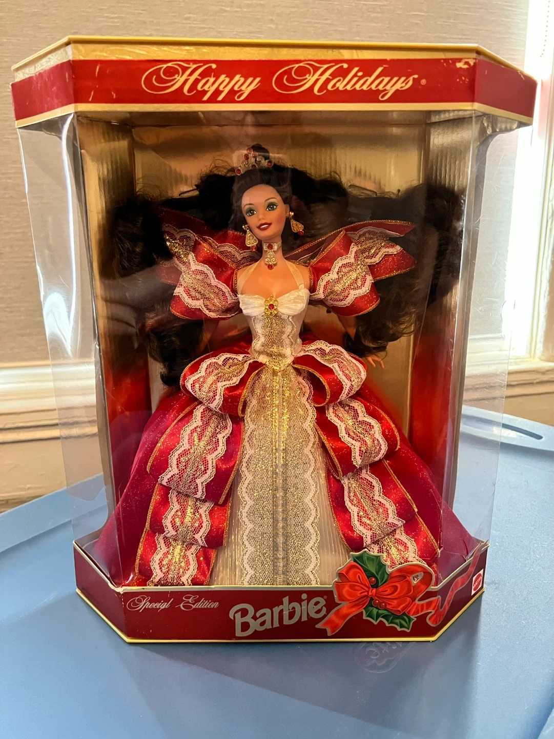 Happy Holidays Barbie Special Edition doll. Doll comes in original packaging with festive red and gold gown. Includes display stand.