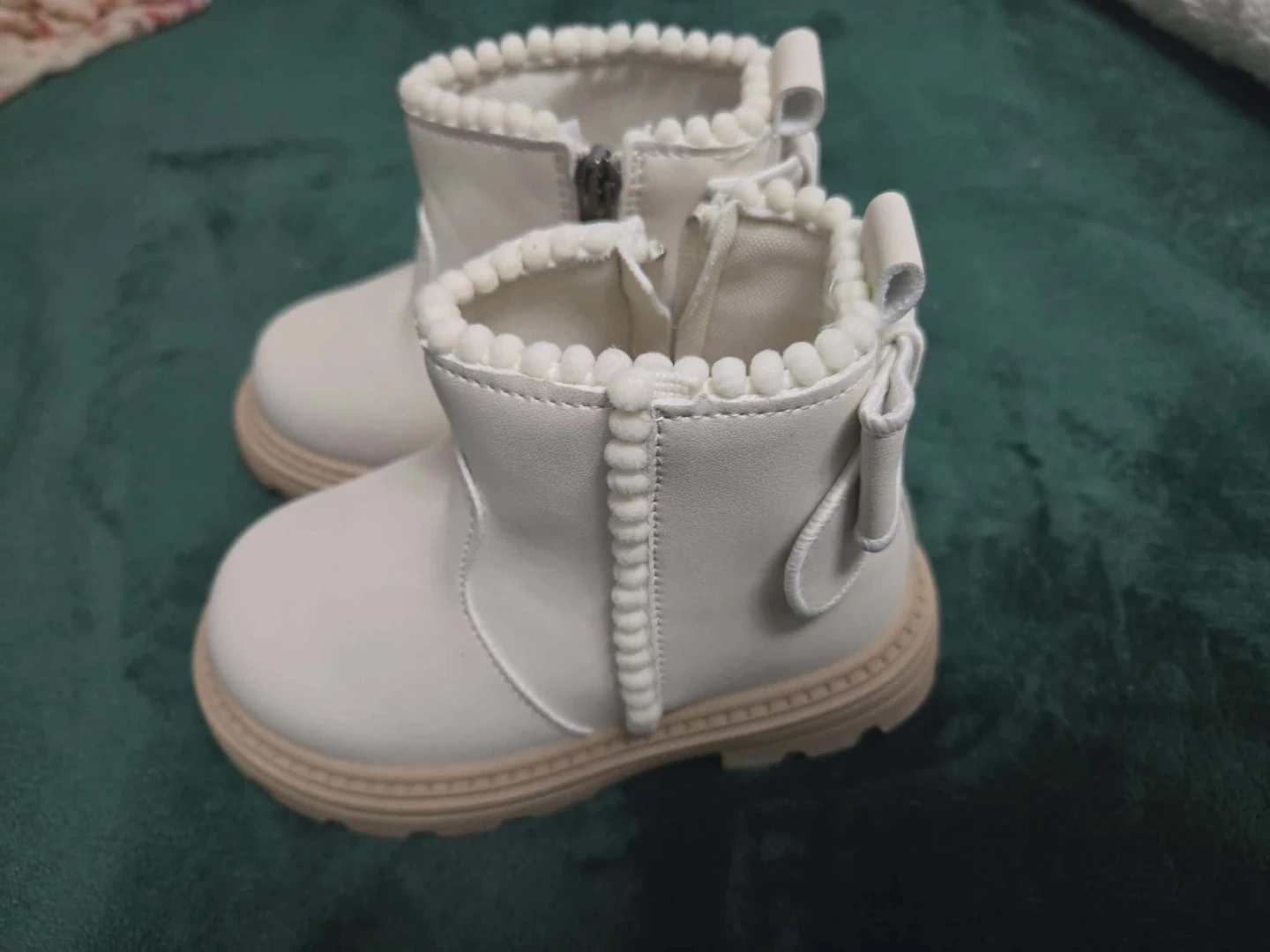 Cute white toddler boots with a side zipper for easy on and off. They feature a decorative pom pom trim around the opening and a bow accent on the back. Perfect for keeping little feet warm and stylish! Size 25