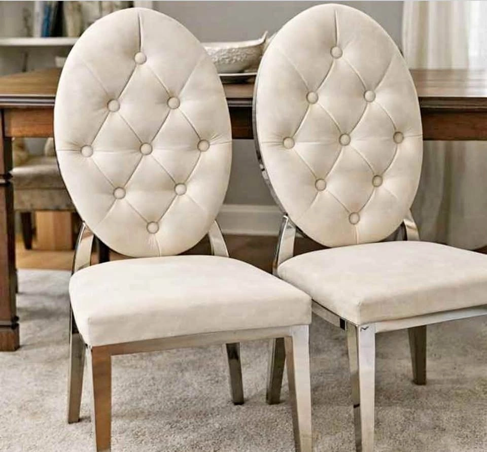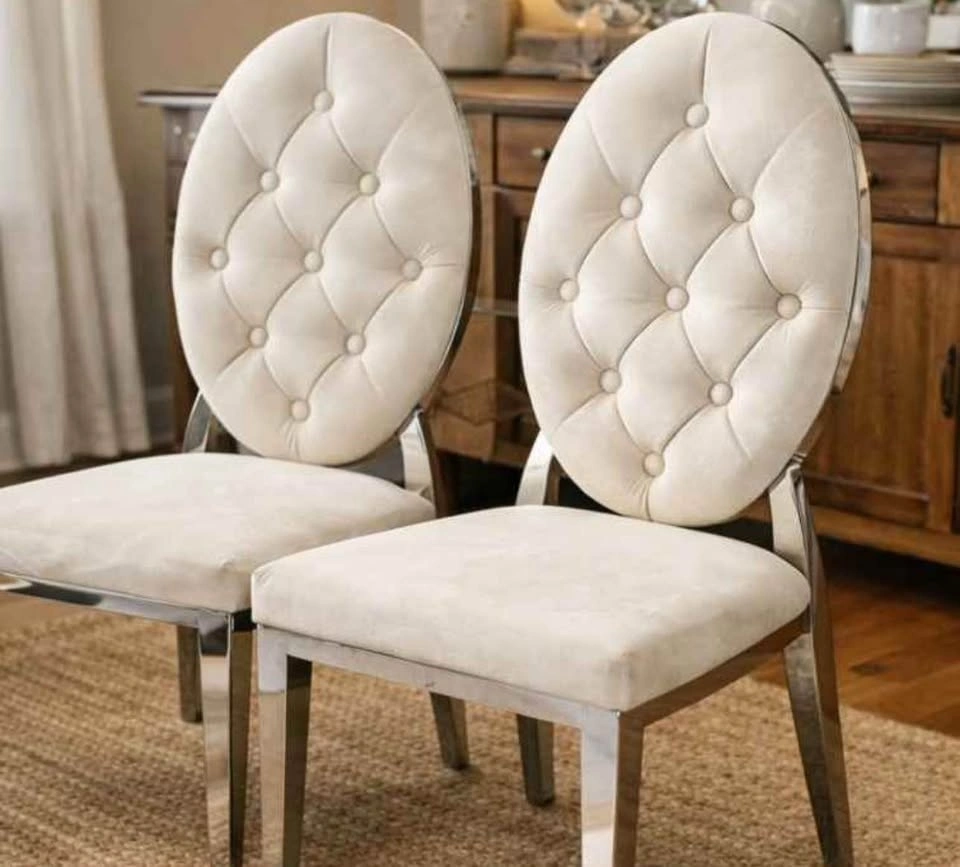 Stylish chairs, a set of two. Cream upholstered seats and backs. Backs have tufted design with buttons. Metal frames are shiny. Great for a dining room or accent chairs.