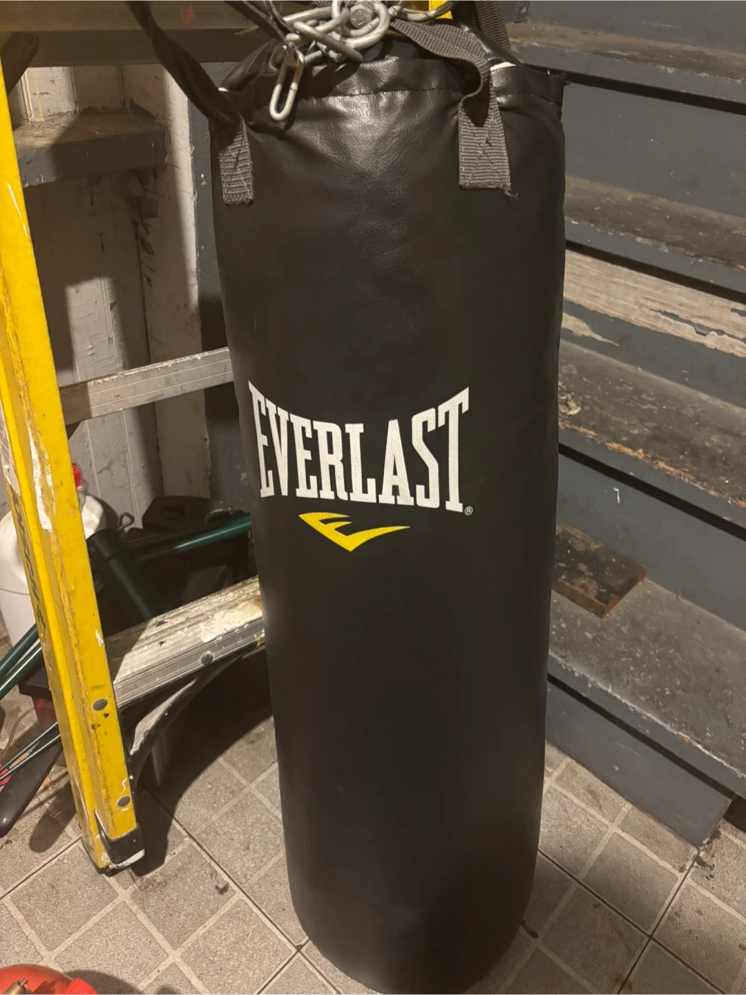Black Everlast punching bag. It's made of durable material and includes hanging straps and chains. Ready for your next workout!