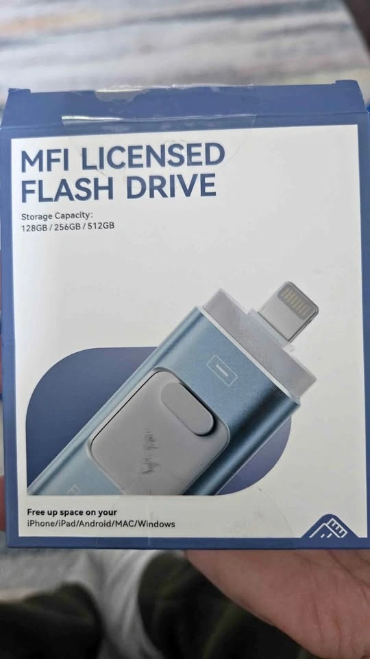 Handy MFI licensed flash drive with 512GB storage. Features a dual connector with Lightning for iPhone/iPad and USB for Android/Mac/Windows. Great for freeing up space on your devices.