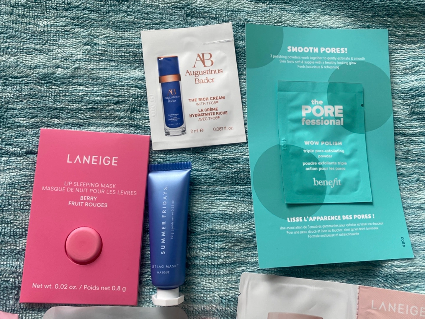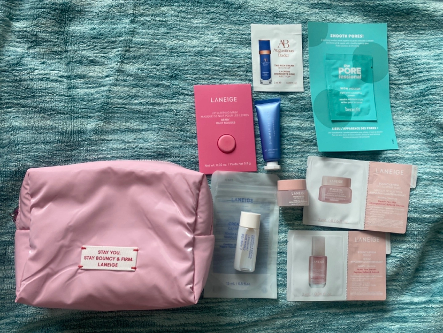 Various skincare samples and a pink LANEIGE cosmetic bag. Includes LANEIGE lip sleeping mask, eye treatment, cream toner, and serums. Augustinus Bader The Rich Cream sample. Benefit Pore Fessional sample. Great for travel or trying new products.