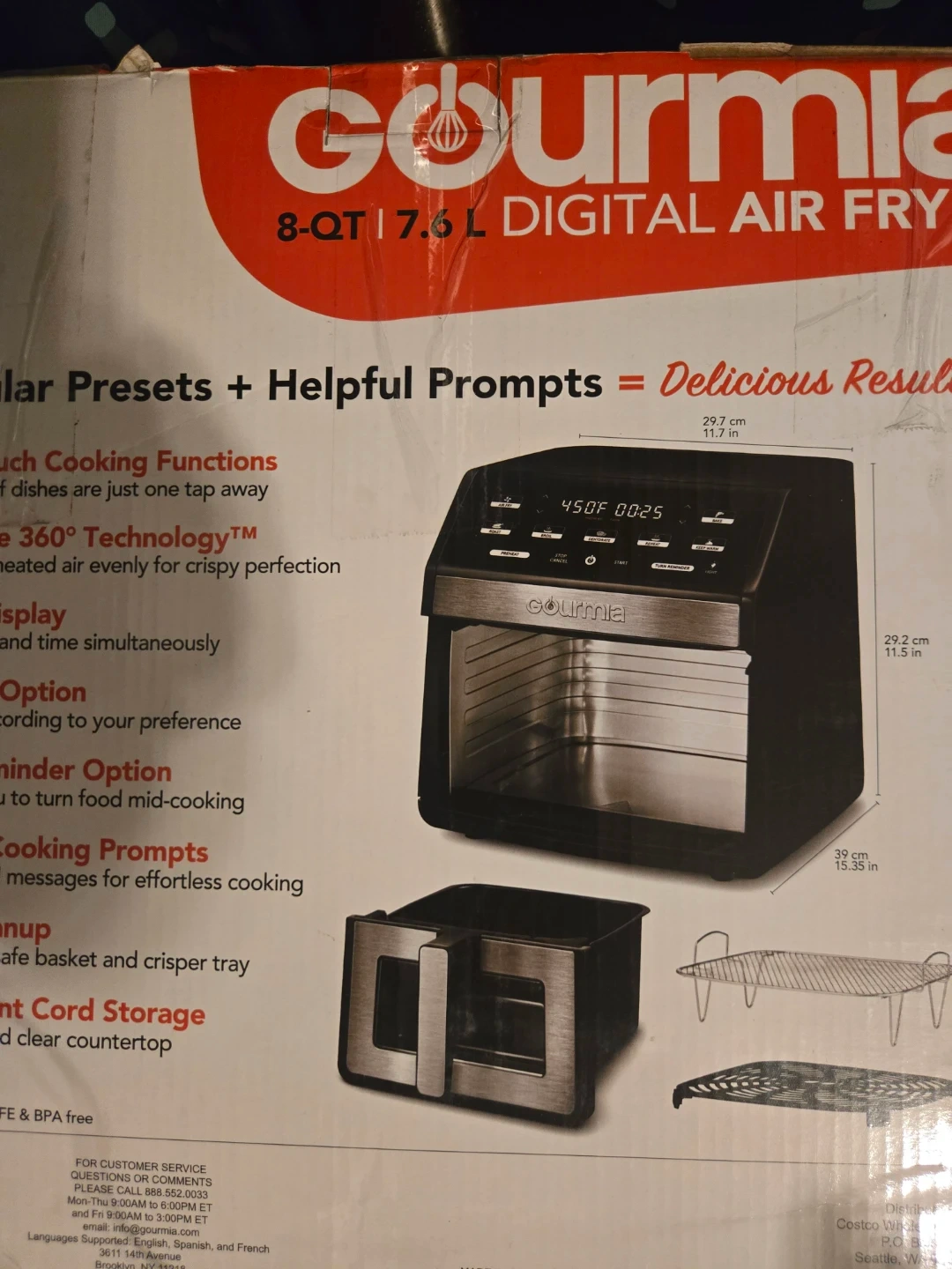 This Gourmia 8-quart digital air fryer offers 7.6 liters of cooking capacity. It features multiple cooking functions including air fry, bake, roast, broil, dehydrate, reheat, and keep warm. The unit includes a downloadable recipe book and a dishwasher-safe basket and crisper tray for easy cleanup.