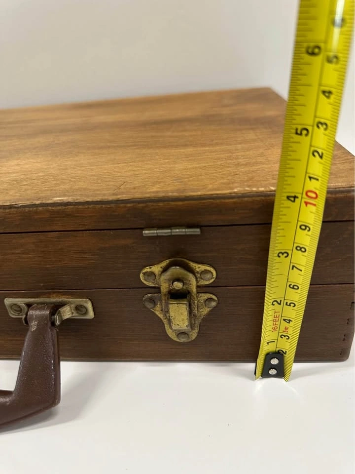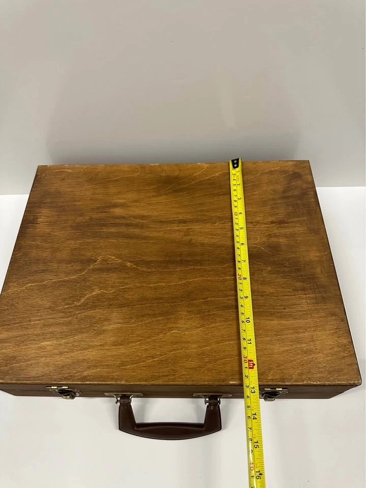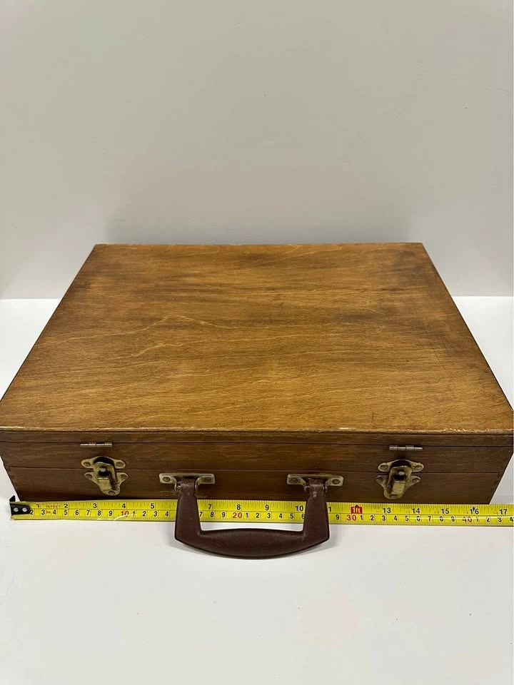 Vintage wooden storage case with handle and metal latches. Inside has compartments — perfect for art supplies, tools, sewing items, or crafts. Good overall condition, shows some signs of use inside (see photos). Solid and functional. Approx size: Length: ~16–17 inches, Width: ~11–12 inches, Height: ~4 inches. Great for storage or decor. Pickup in Buffalo Grove.