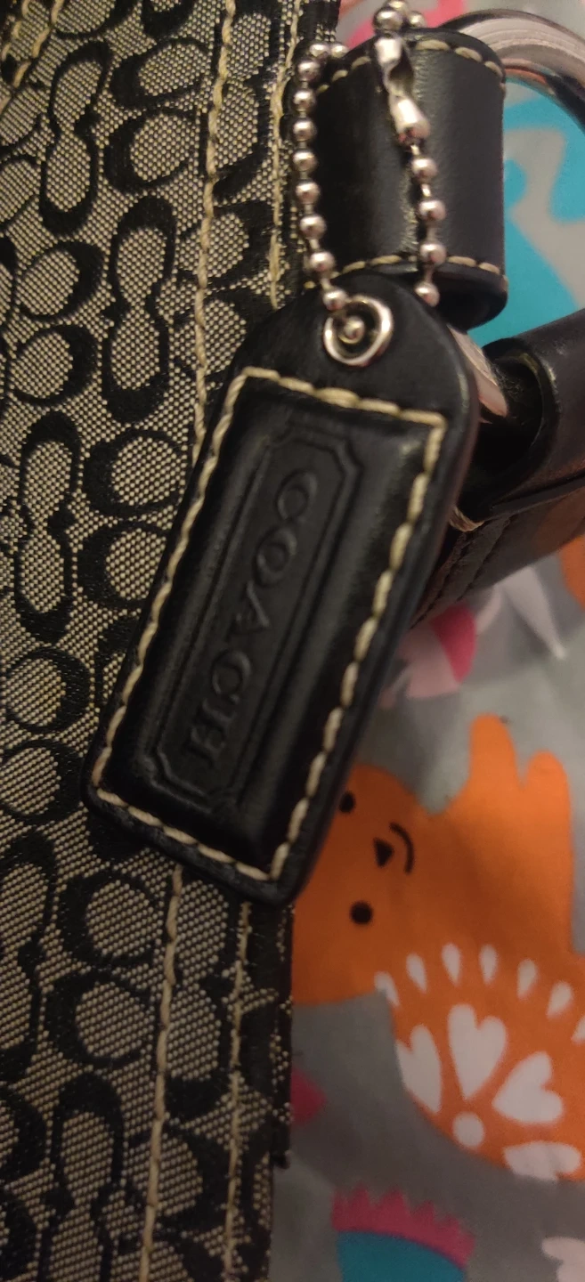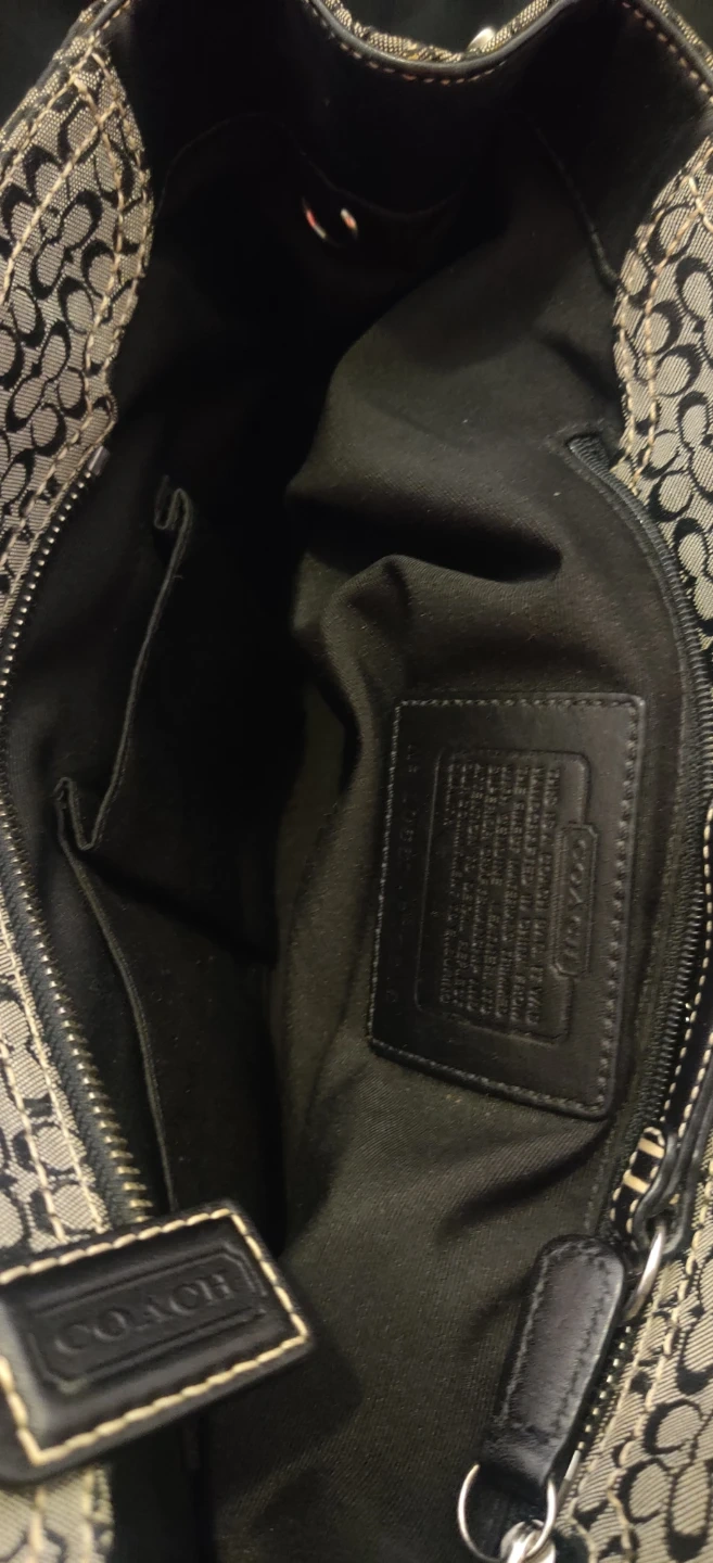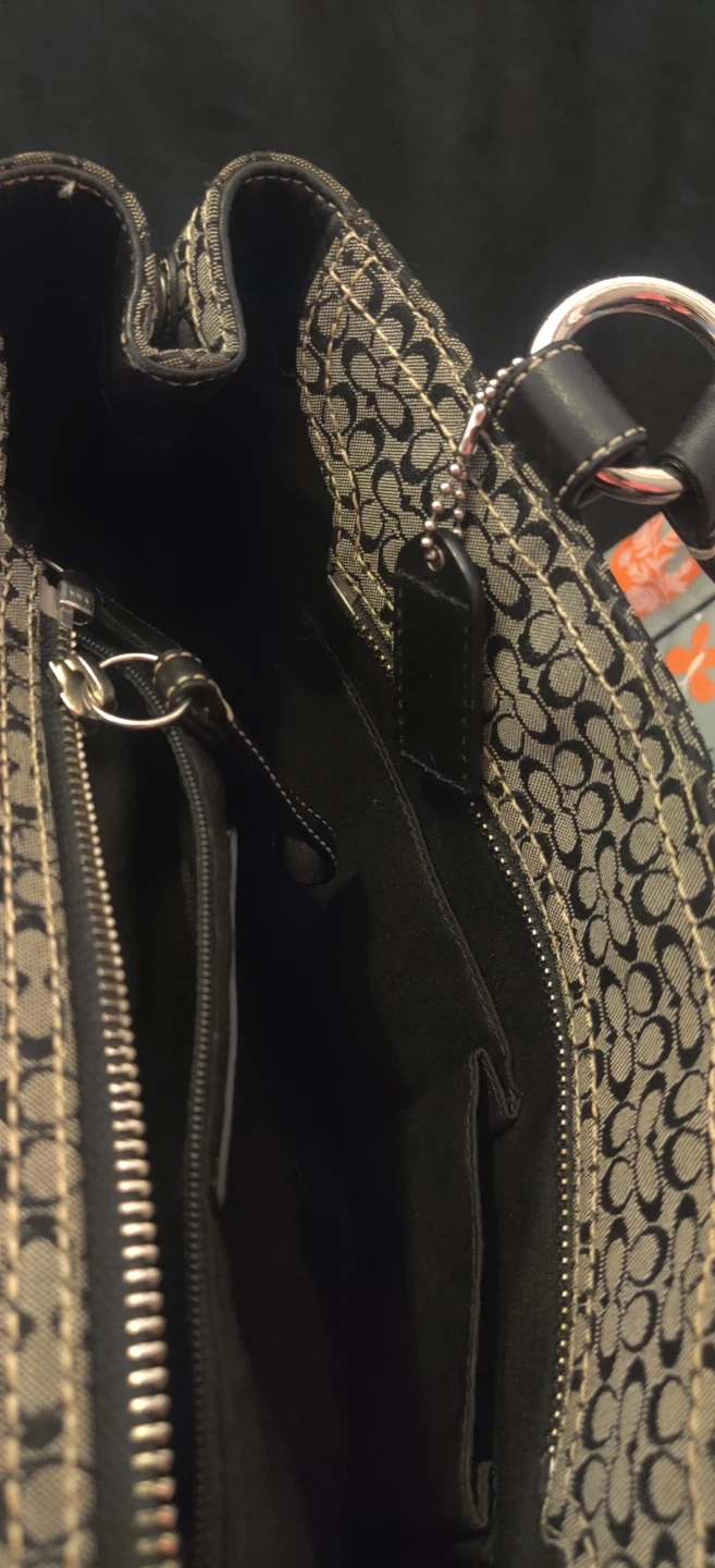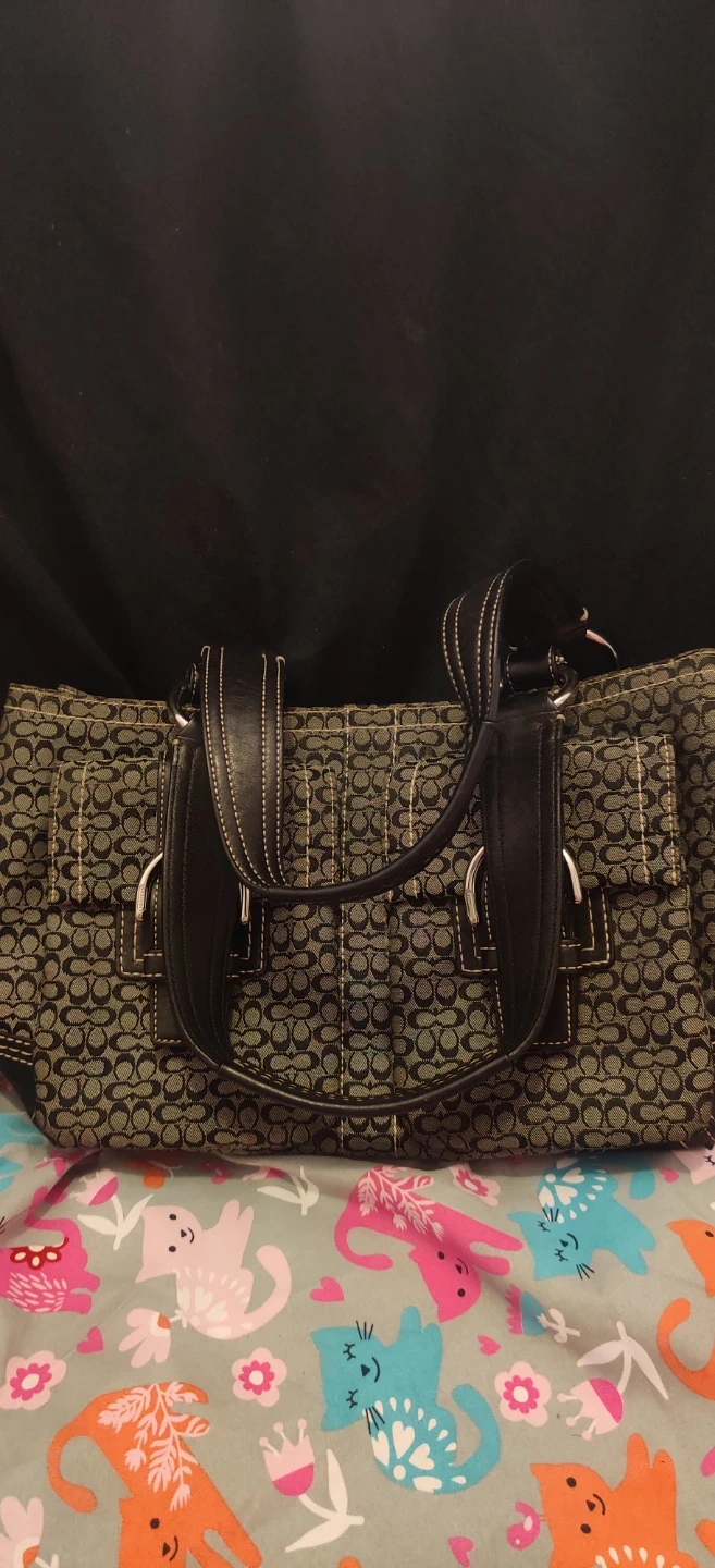Coach signature monogram satchel handbag with black leather accents. It features multiple interior pockets and a zippered closure. This bag is crafted from durable canvas material.Bag is medium size.