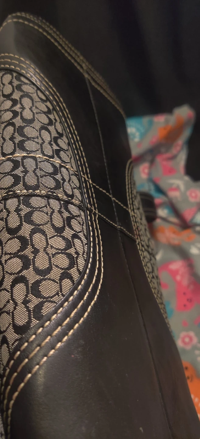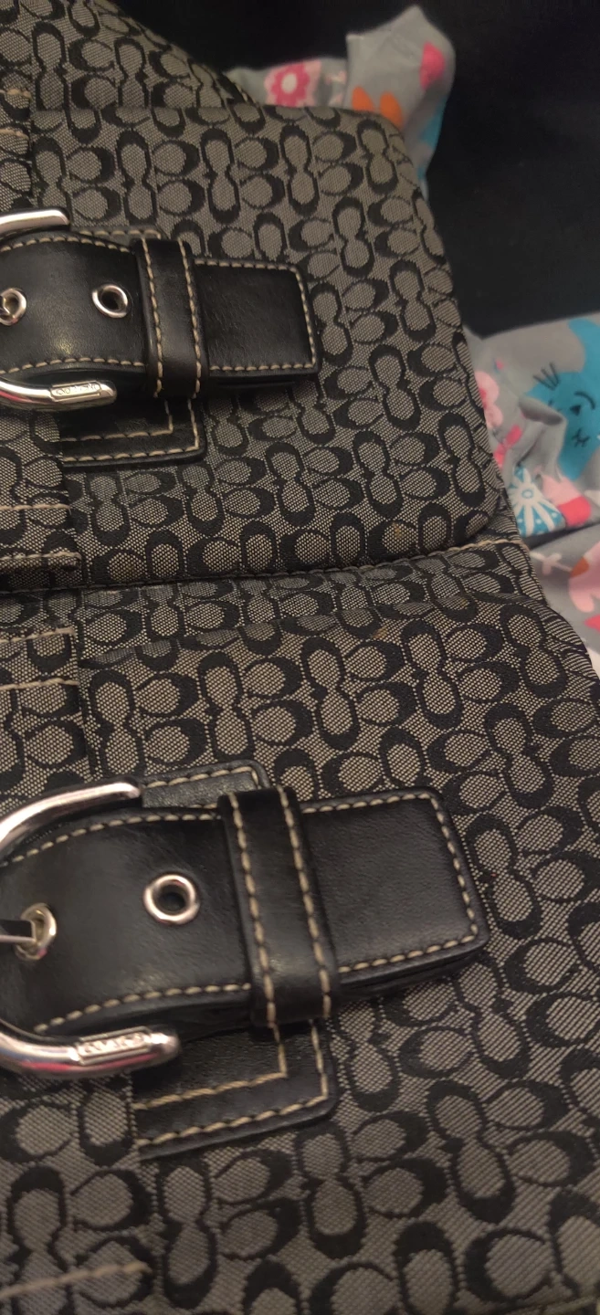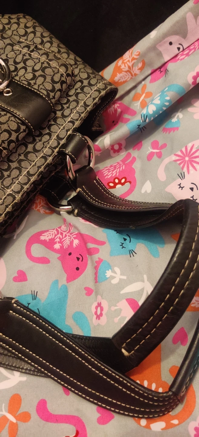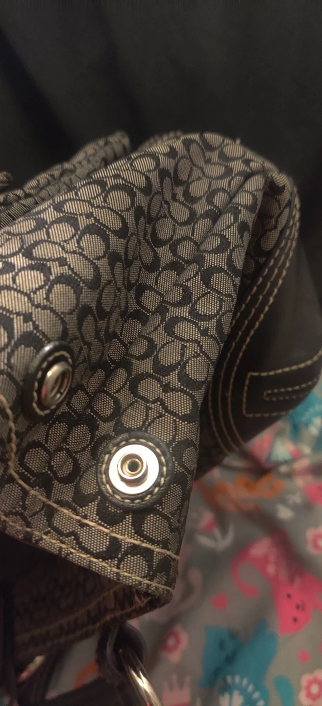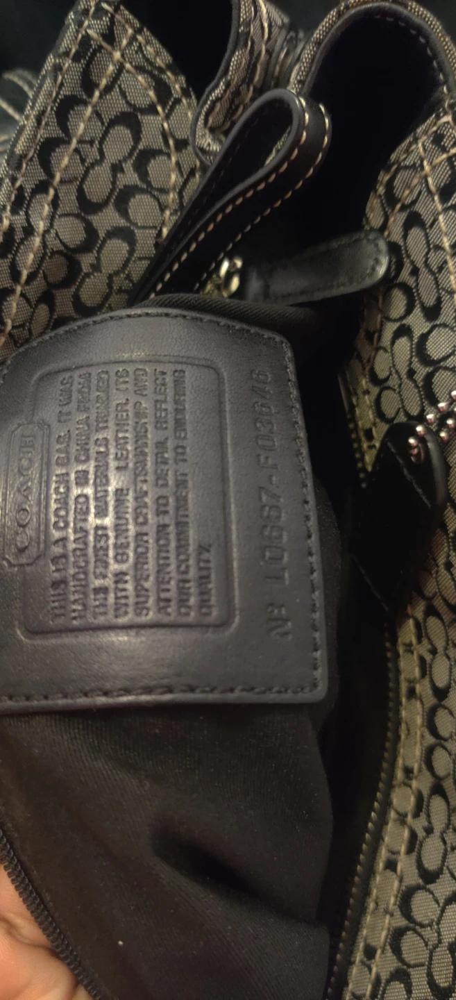 Coach signature monogram satchel handbag with black leather accents. It features multiple interior pockets and a zippered closure. This bag is crafted from durable canvas material.Bag is medium size.