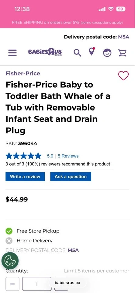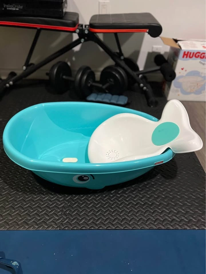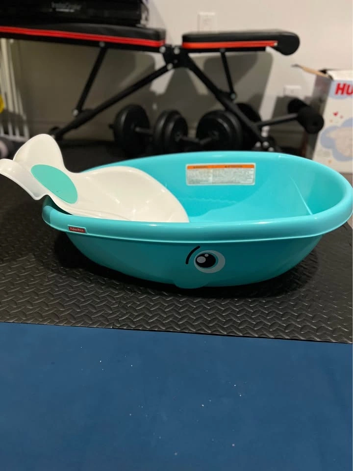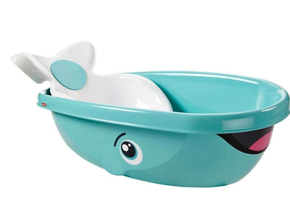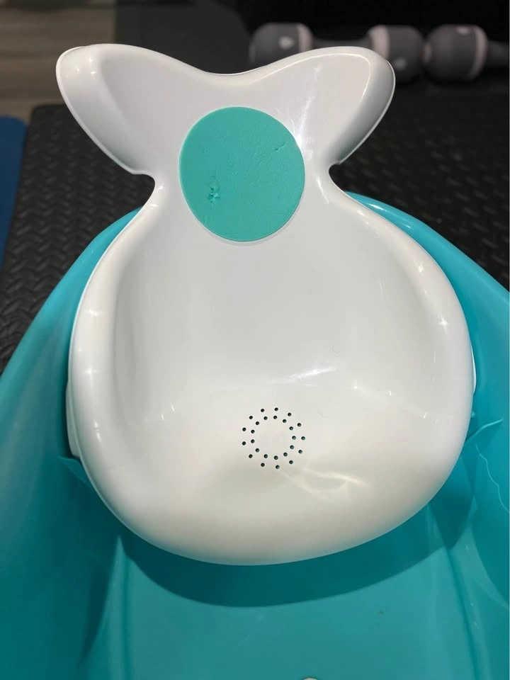 This adorable whale character tub comes with a cozy, contoured infant seat and soft foam headrest to keep little ones comfy. As your baby grows, remove the newborn seat to add more room on the non-slip surface for your toddler. The Whale of a Tub fits in most sinks and bathtubs and features an innovative flush drain plug, making cleanup a snap. The headrest foam has a little nick, but it shouldn't bother the baby.