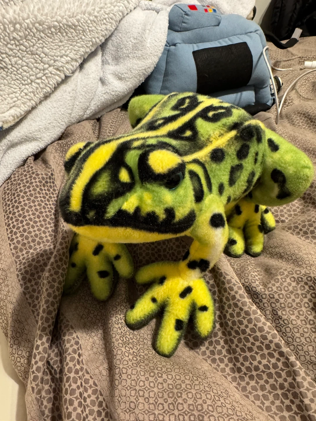 Selling a cute plush frog with a unique green and yellow spotted pattern! It's in great condition and would make a fun addition to any collection or a cuddly friend for someone special
