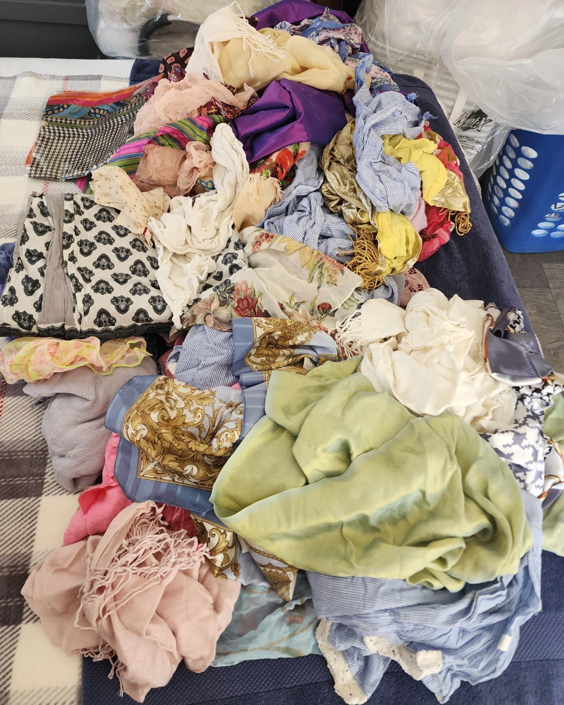 This is a bundle of various scarves. Includes floral prints, stripes, and solid colors in different materials like silk and cotton. Some pieces feature lace trim and intricate patterns.