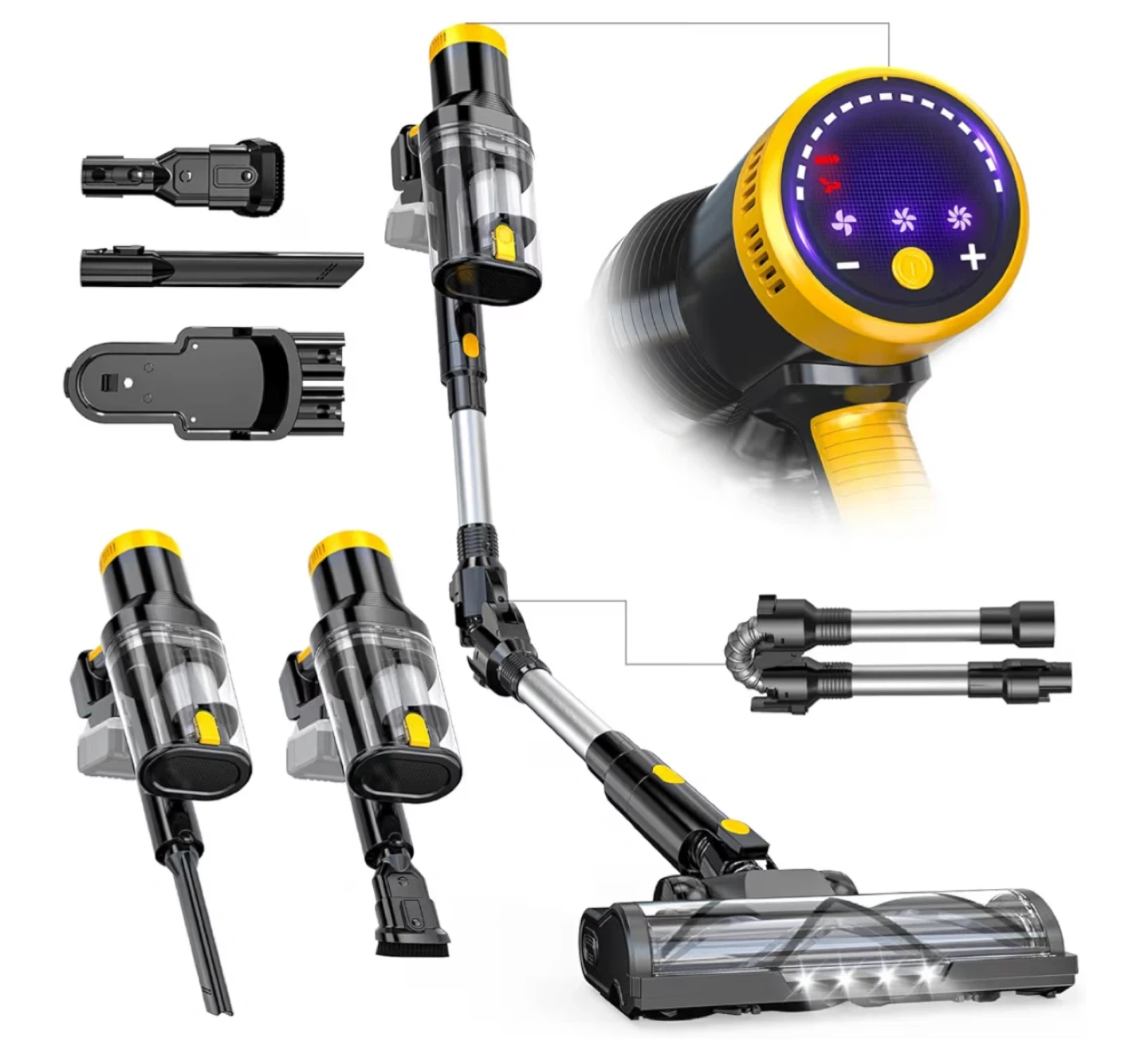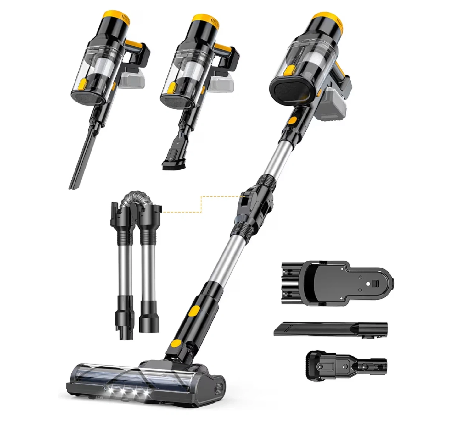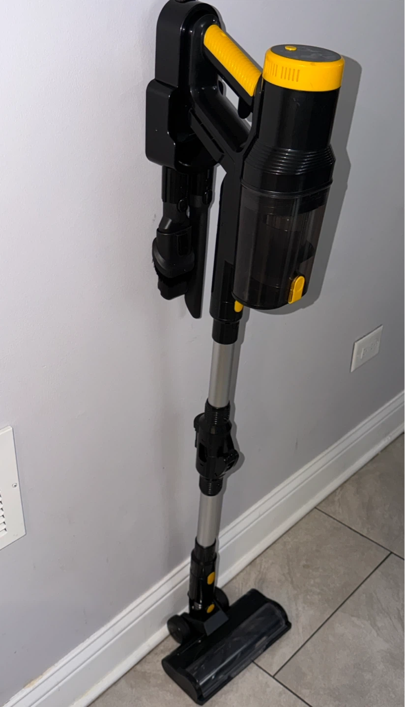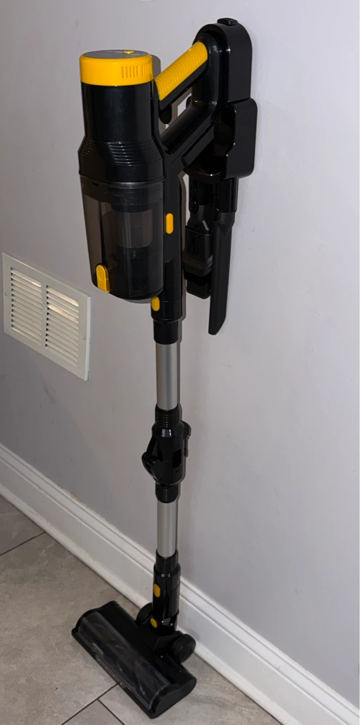 This is a cordless stick vacuum cleaner. It's black and yellow with a clear dustbin. Comes with multiple attachments for different cleaning needs.