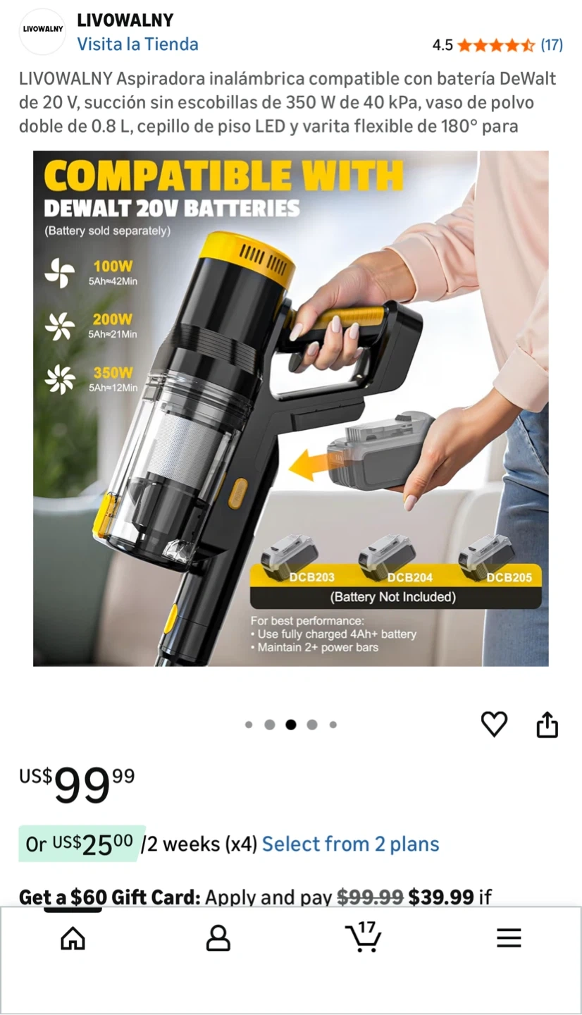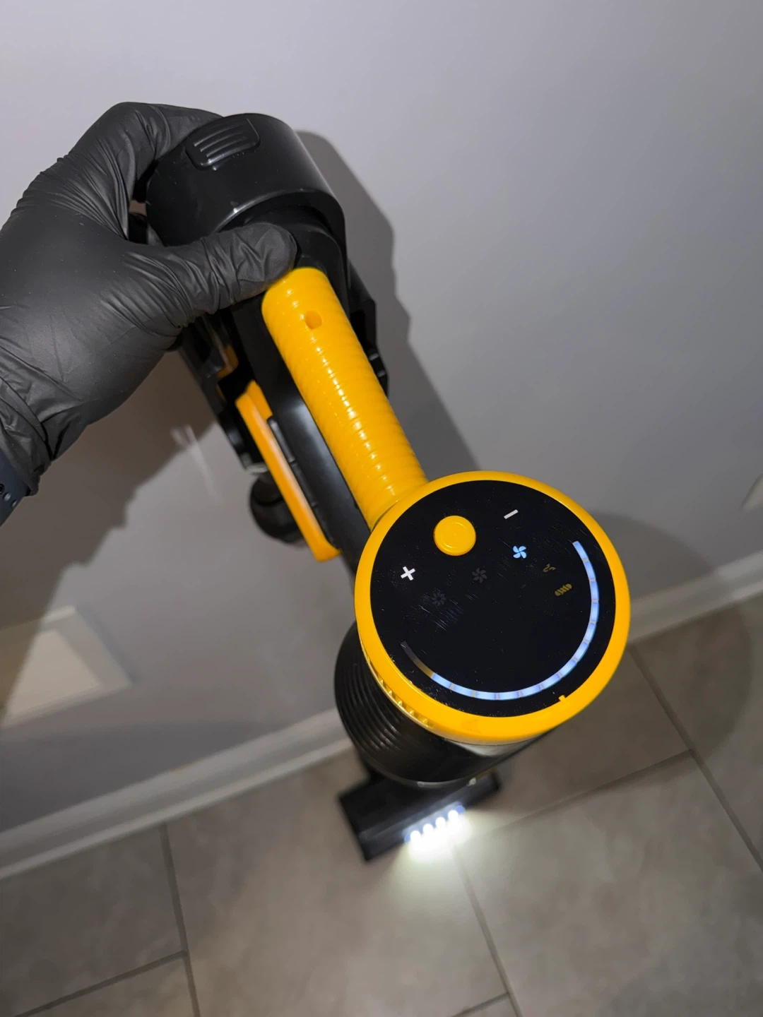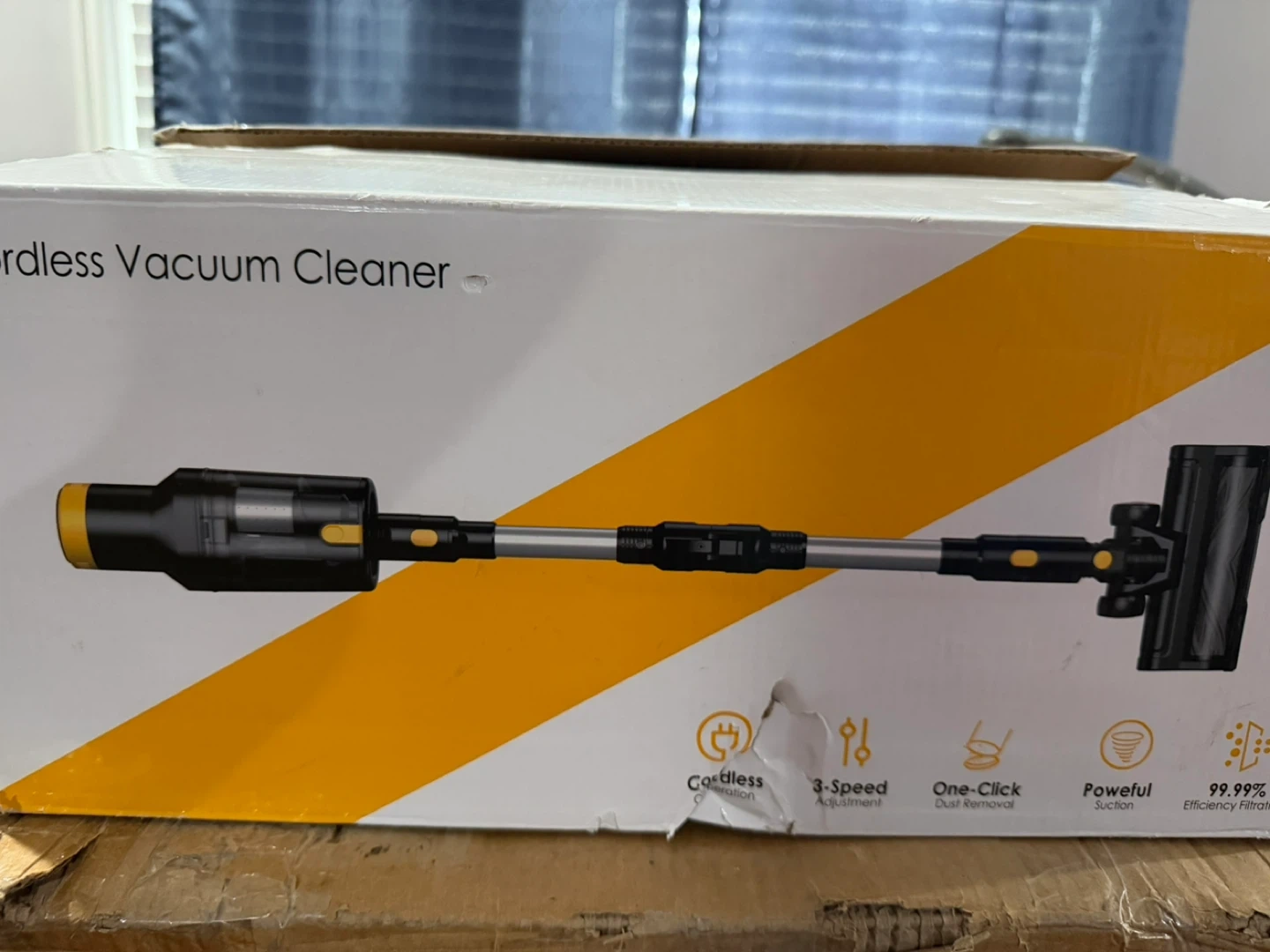 This is a cordless stick vacuum cleaner. It's black and yellow with a clear dustbin. Comes with multiple attachments for different cleaning needs.