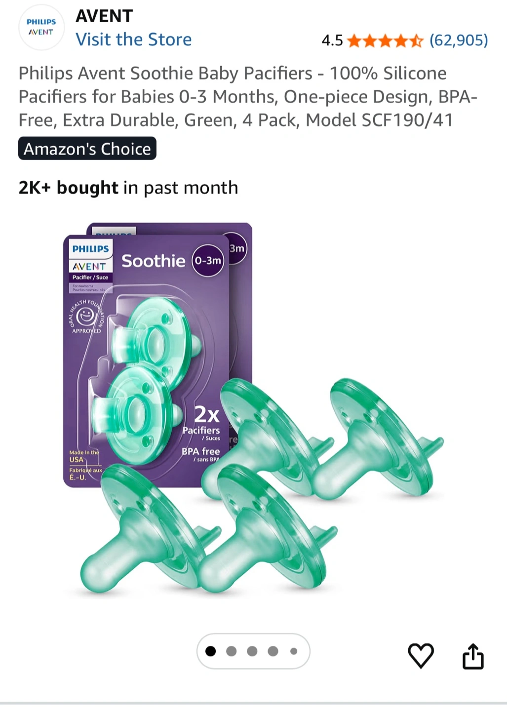 Philips Avent Soothie baby pacifiers in a 4-pack. These are made of 100% silicone and are BPA-free. Designed for babies 0-3 months old.