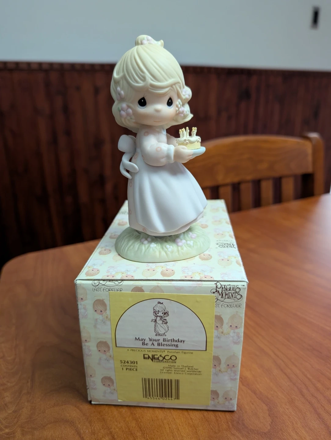This Precious Moments porcelain figurine is titled 'May Your Birthday Be A Blessing'. It was made in Thailand and includes the original box. A wonderful gift for birthdays!