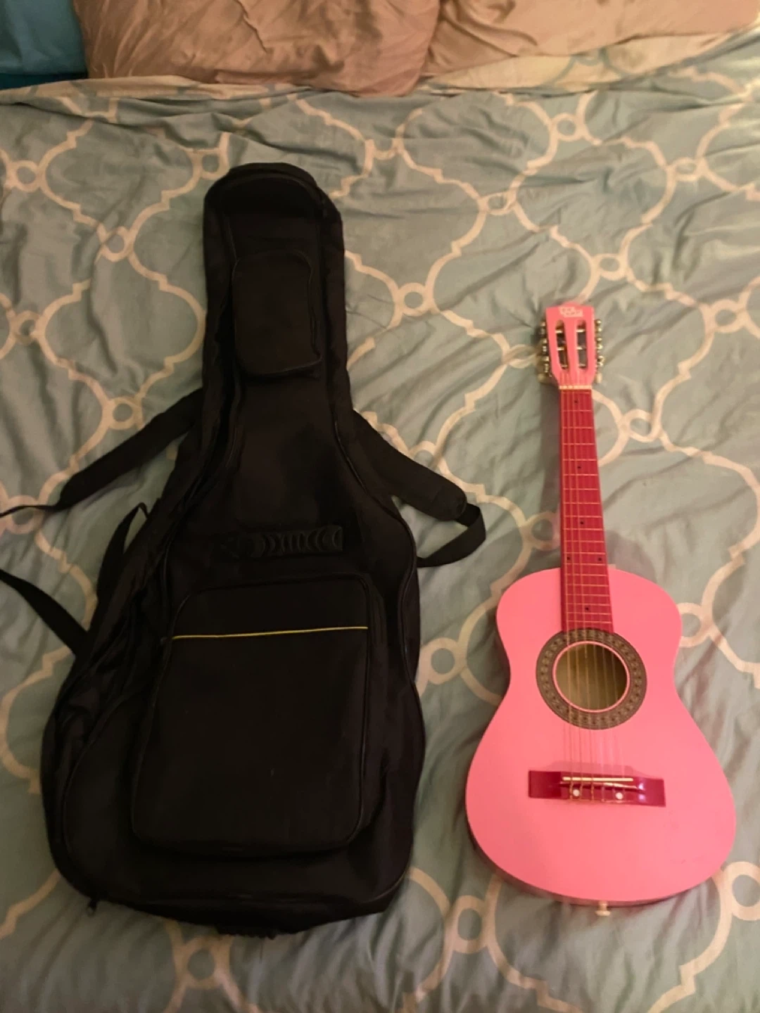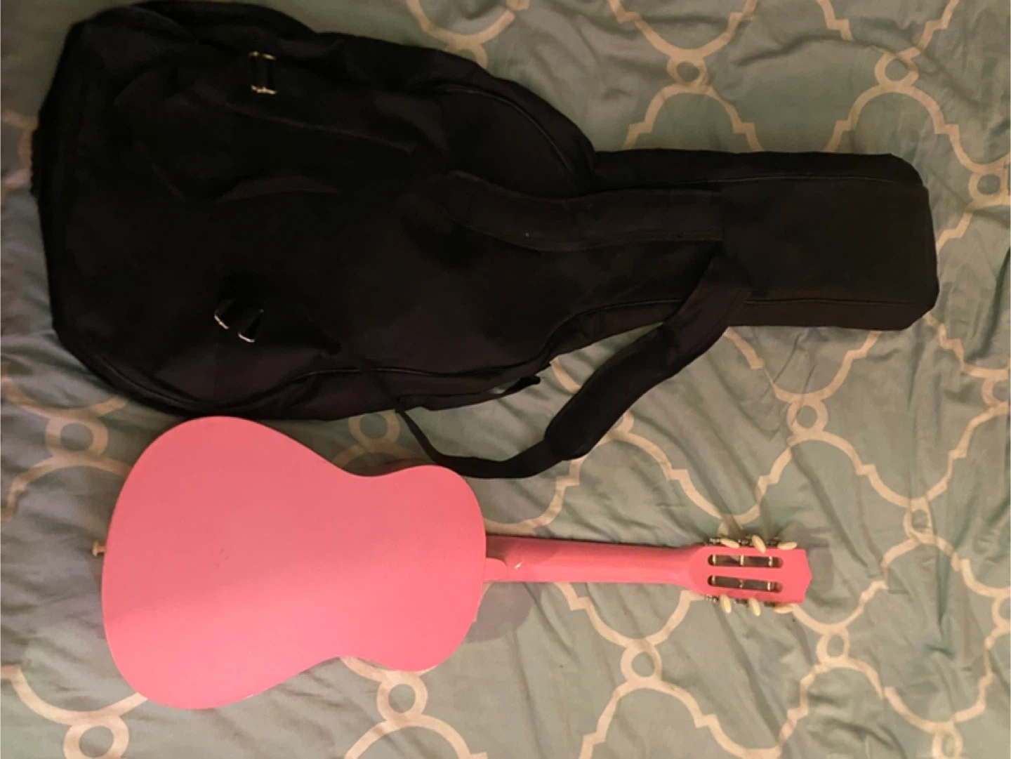 This is a pink acoustic guitar, perfect for young aspiring musicians. It includes a black gig bag for easy transport and storage. A fun way to introduce kids to music!