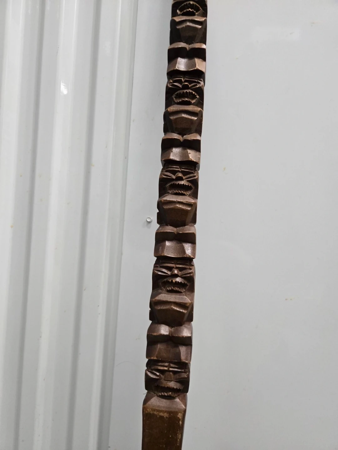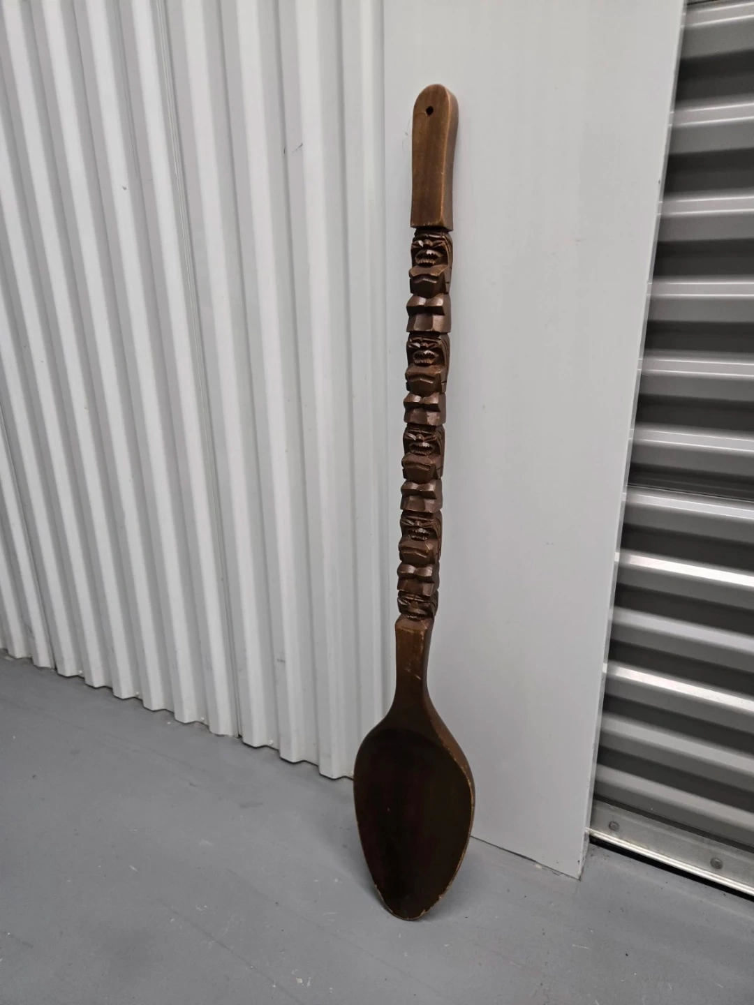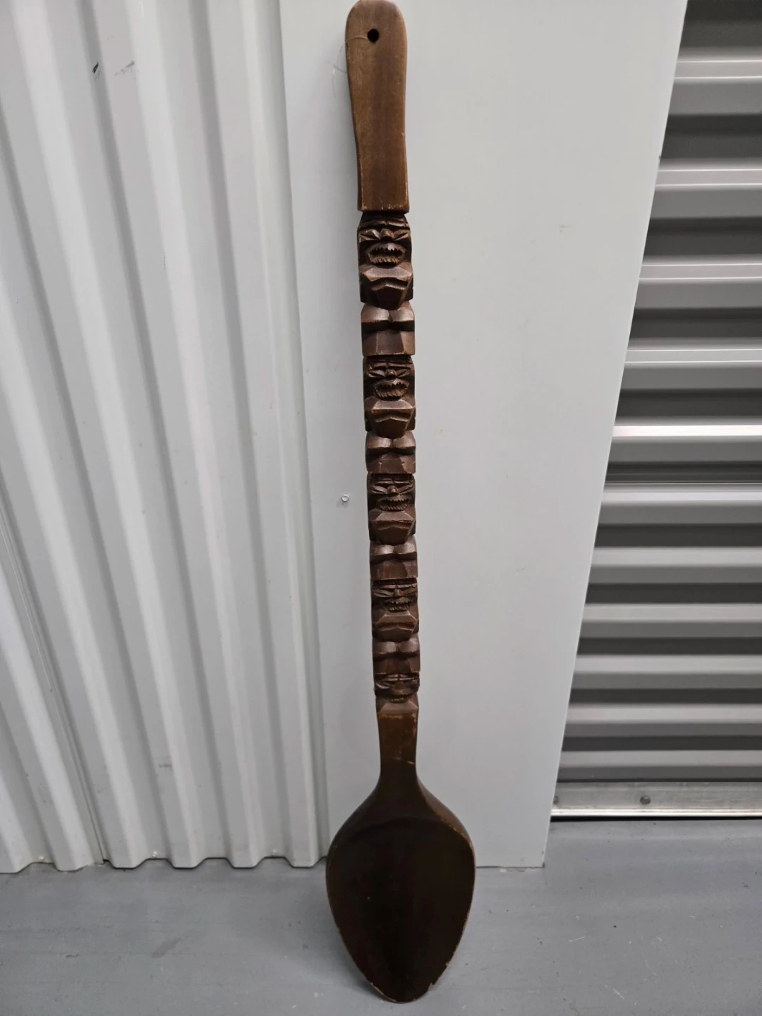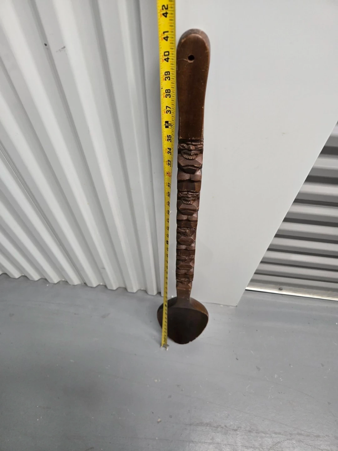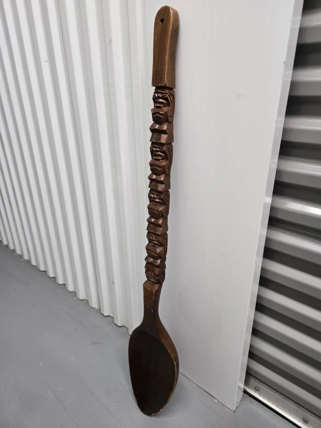 This is a large, decorative wooden spoon featuring a carved tiki totem design along the handle. It measures approximately 42 inches in length. It's a unique piece for kitchen decor or display!