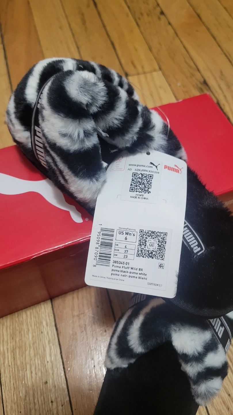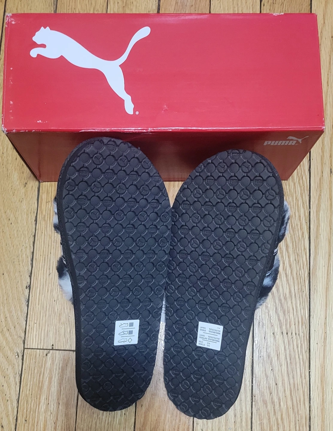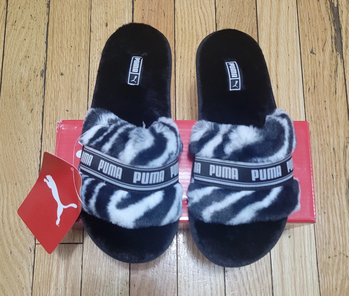 These Puma Fenty Wild x Fur slides come in a black and white zebra print. The upper is textile faux fur with a textile faux fur lining. The sole is EVA. Comes with original box.