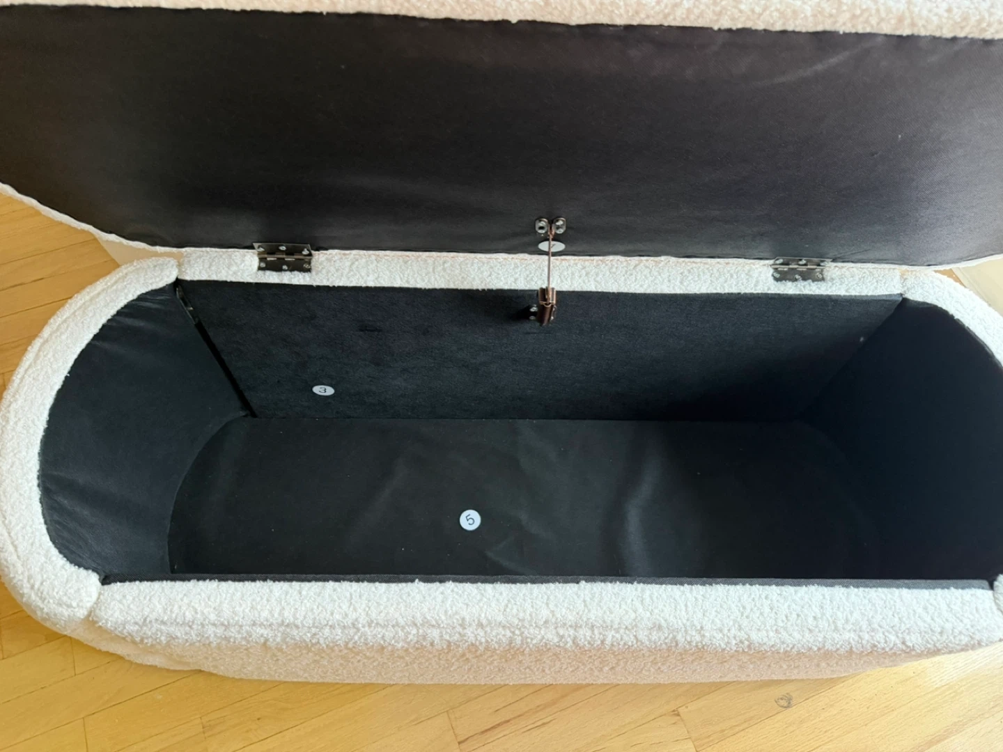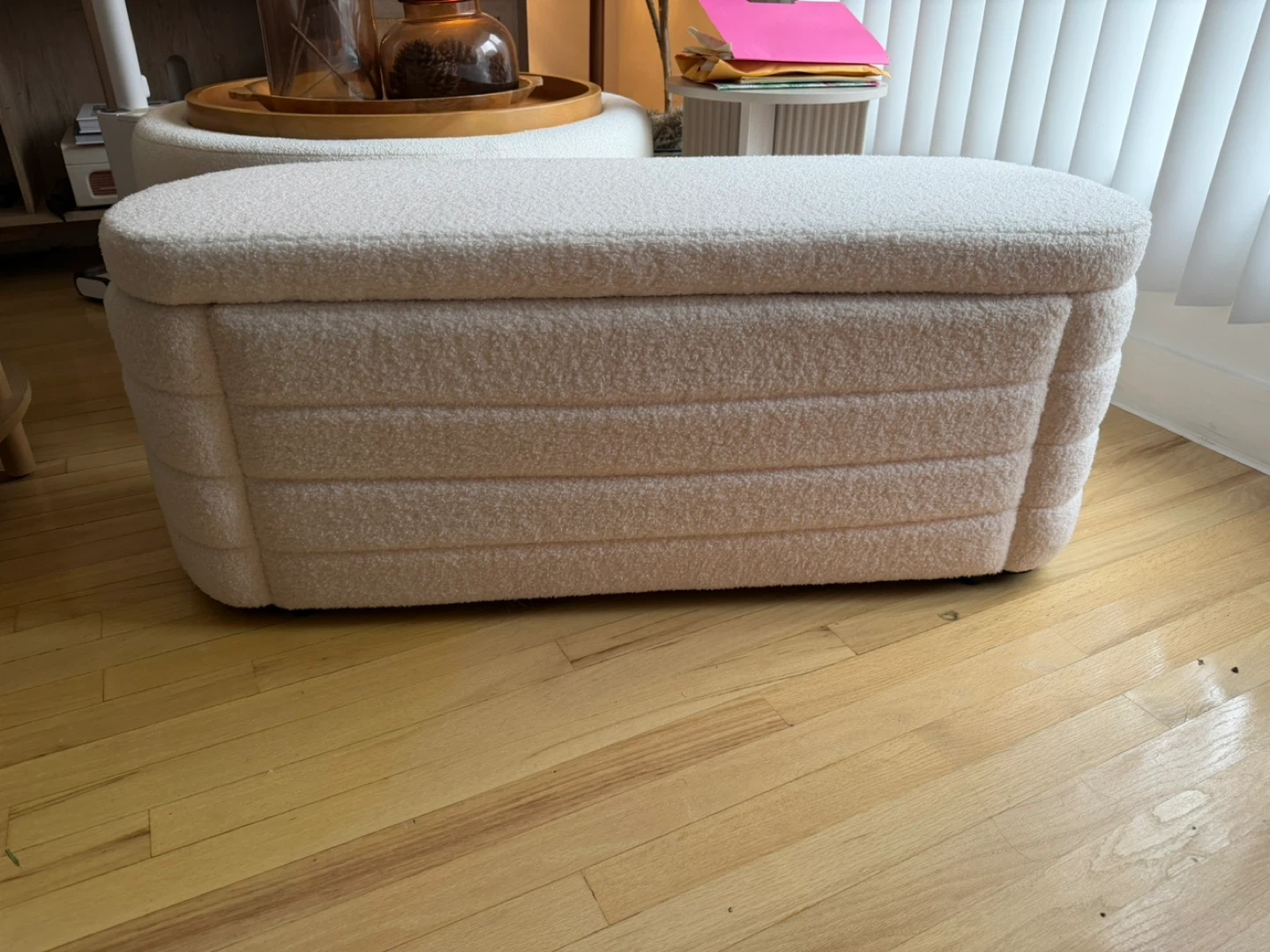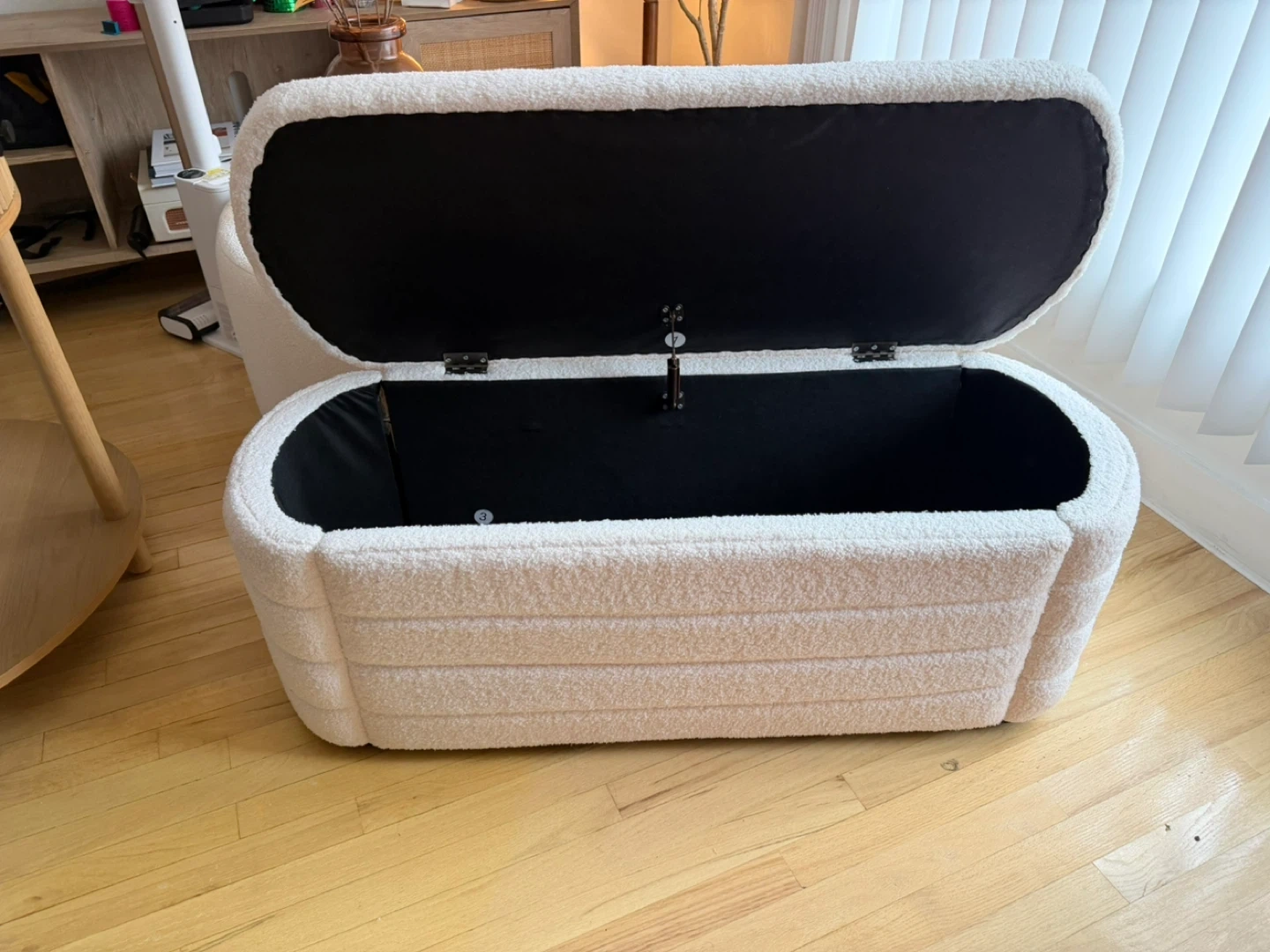 This storage ottoman is upholstered in a soft, white teddy fabric with a ribbed design. It's perfect for stowing away blankets, toys, or other household items. It's a great addition to a living room or bedroom for extra seating and storage!