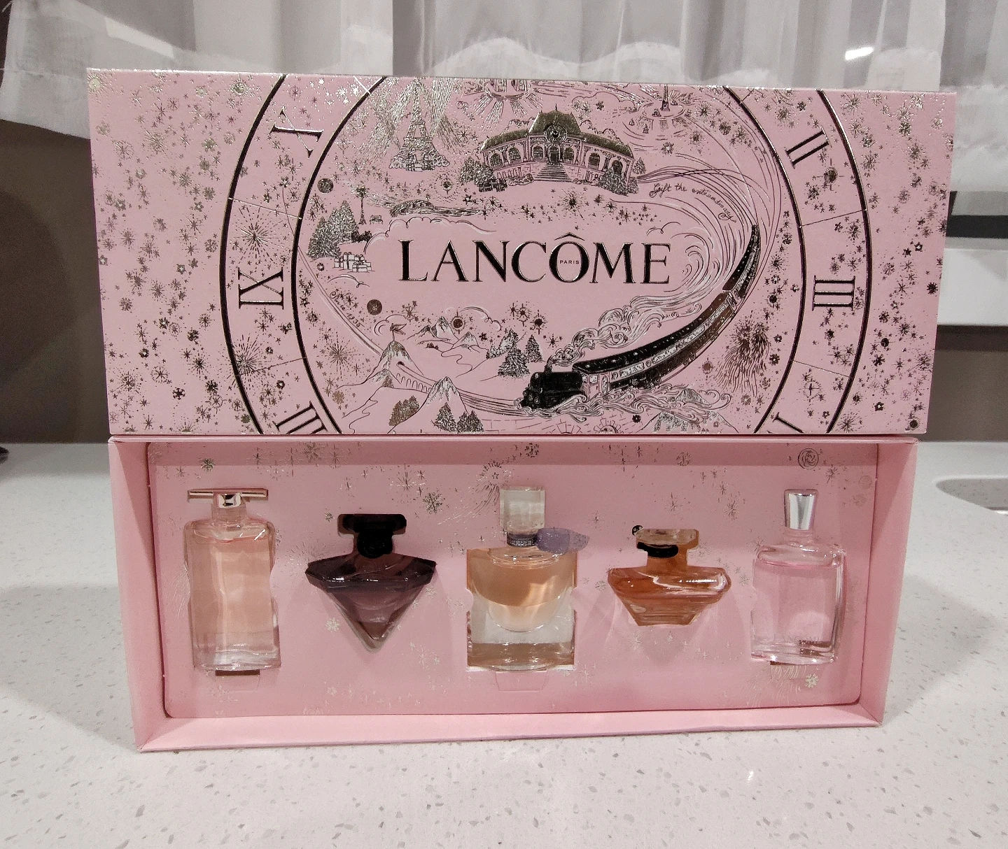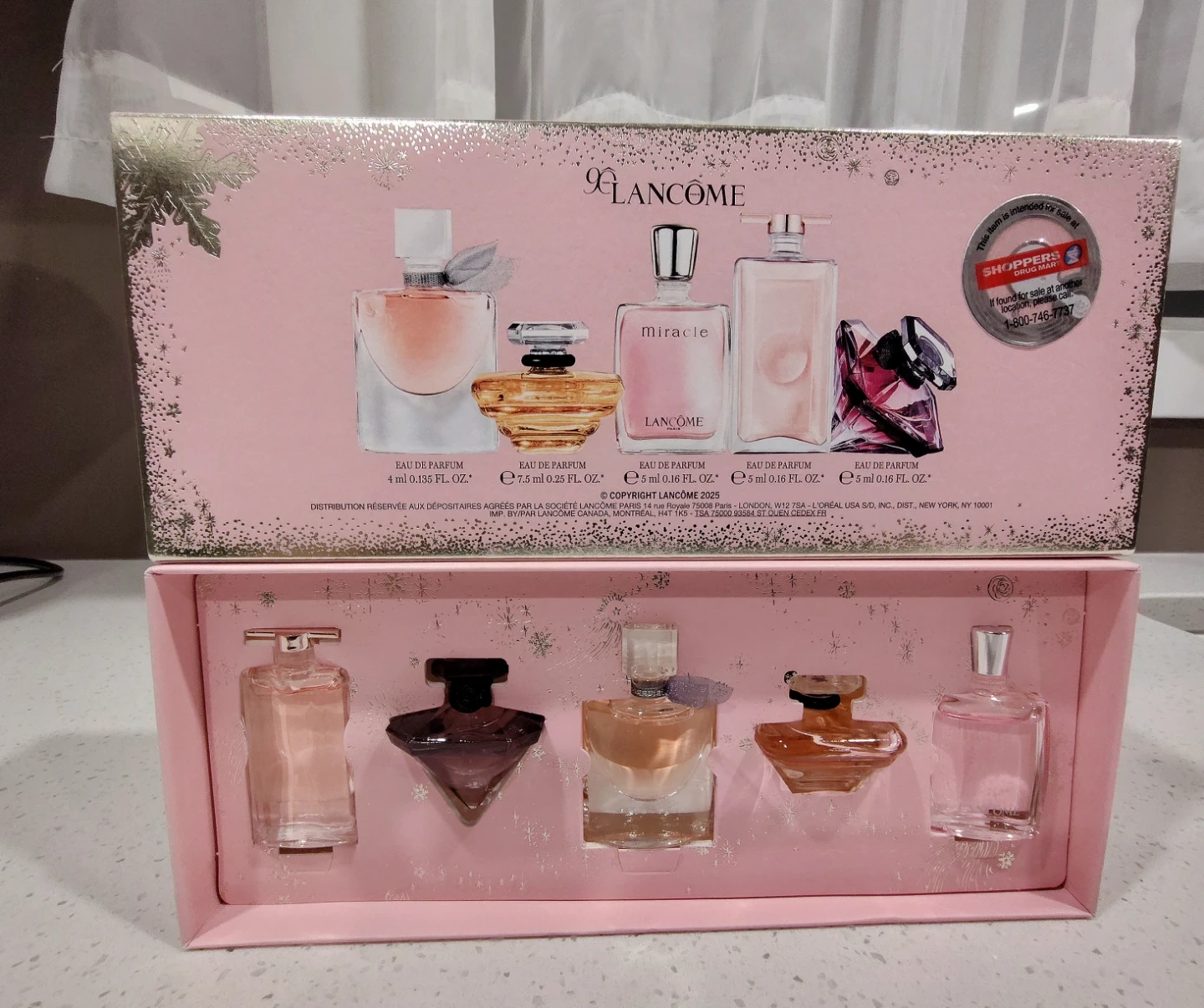 This gift set features five miniature Lancôme perfumes. Includes a variety of scents in travel-friendly sizes. Great for trying out different fragrances!