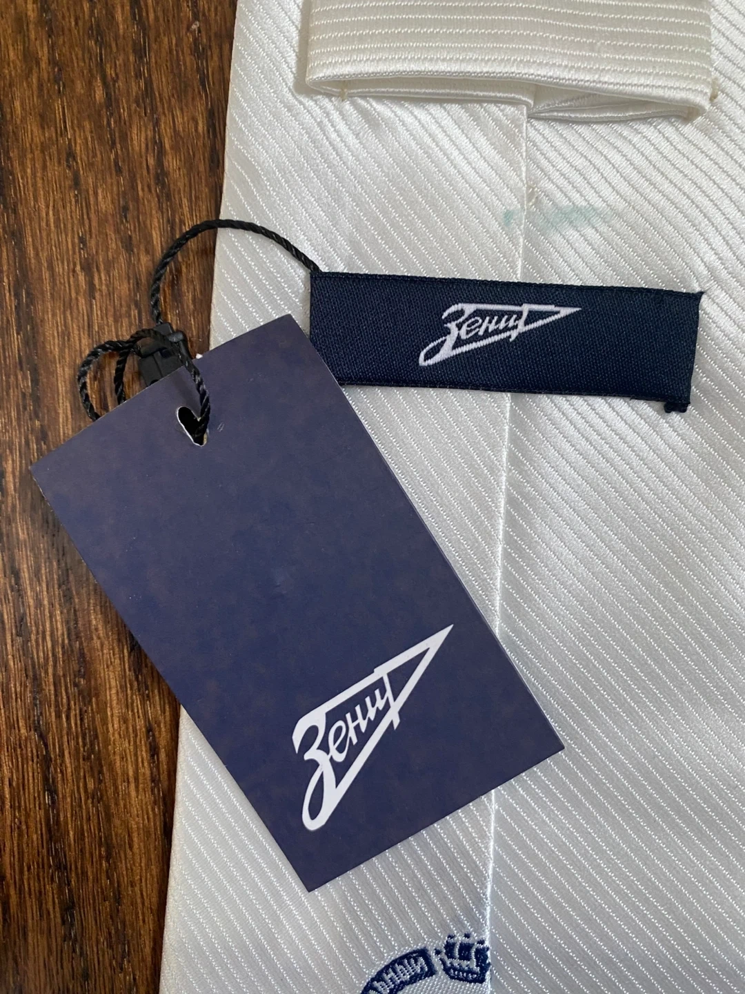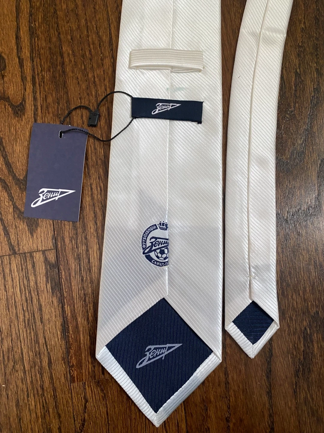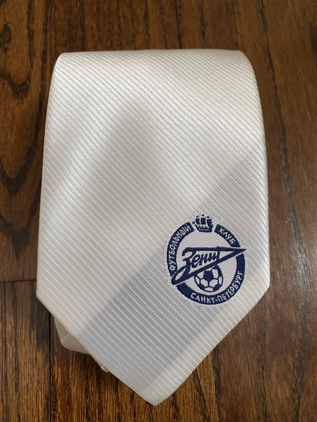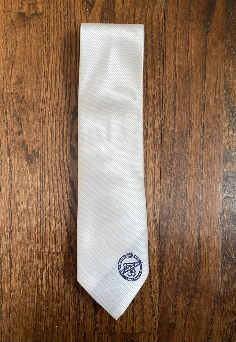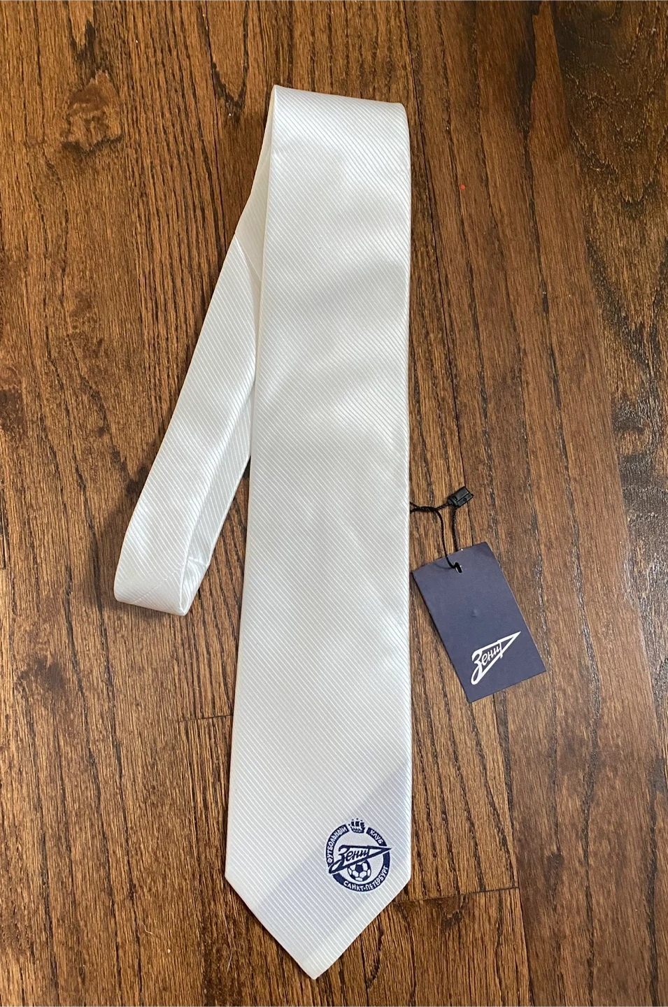 This white tie features the Zenit St. Petersburg football club logo embroidered on the front. It's made of a satin-like material with a subtle ribbed texture. The tie includes its original tag, making it a great accessory for any fan!