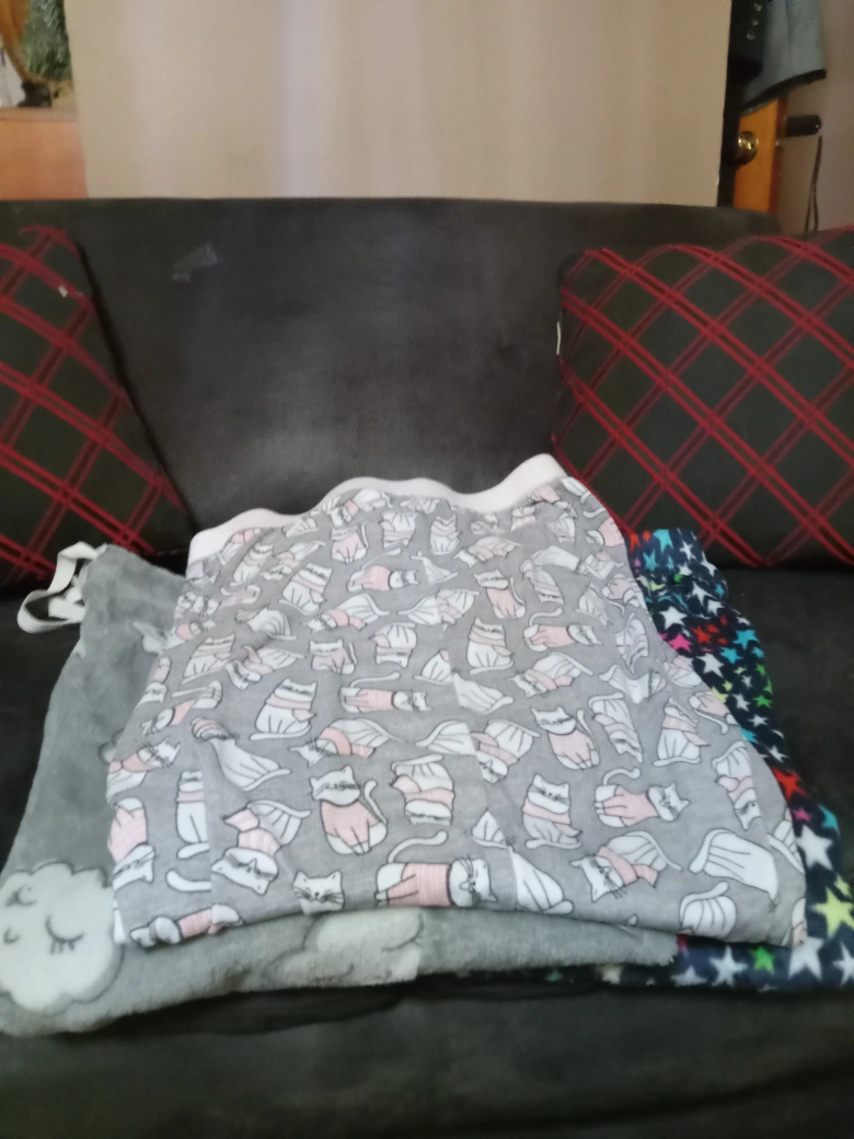 Soft fleece blanket with cat pattern. Grey and pink. Another blanket is included, as well as a third smaller blanket with stars.