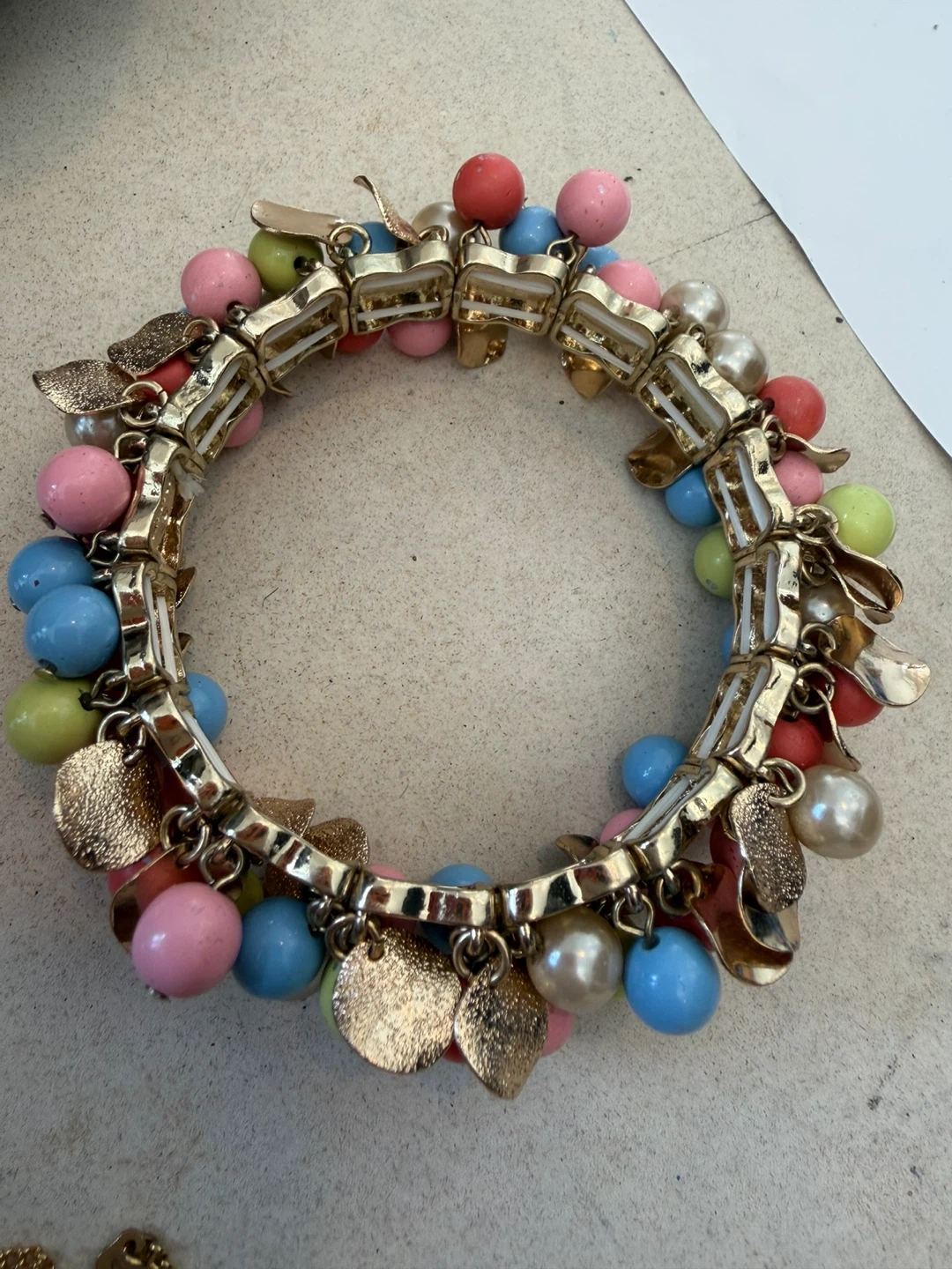 This charming bracelet features a colorful assortment of beads and delicate gold-tone leaf charms. It's designed to add a playful pop of color to any outfit. The clasp mechanism appears to be secure.