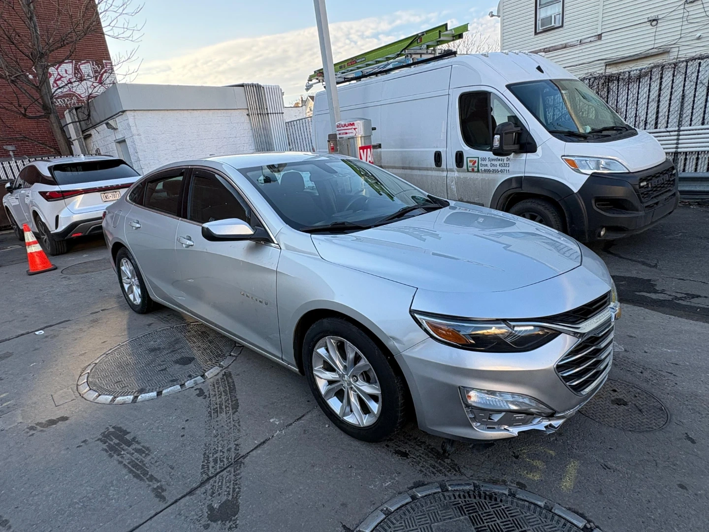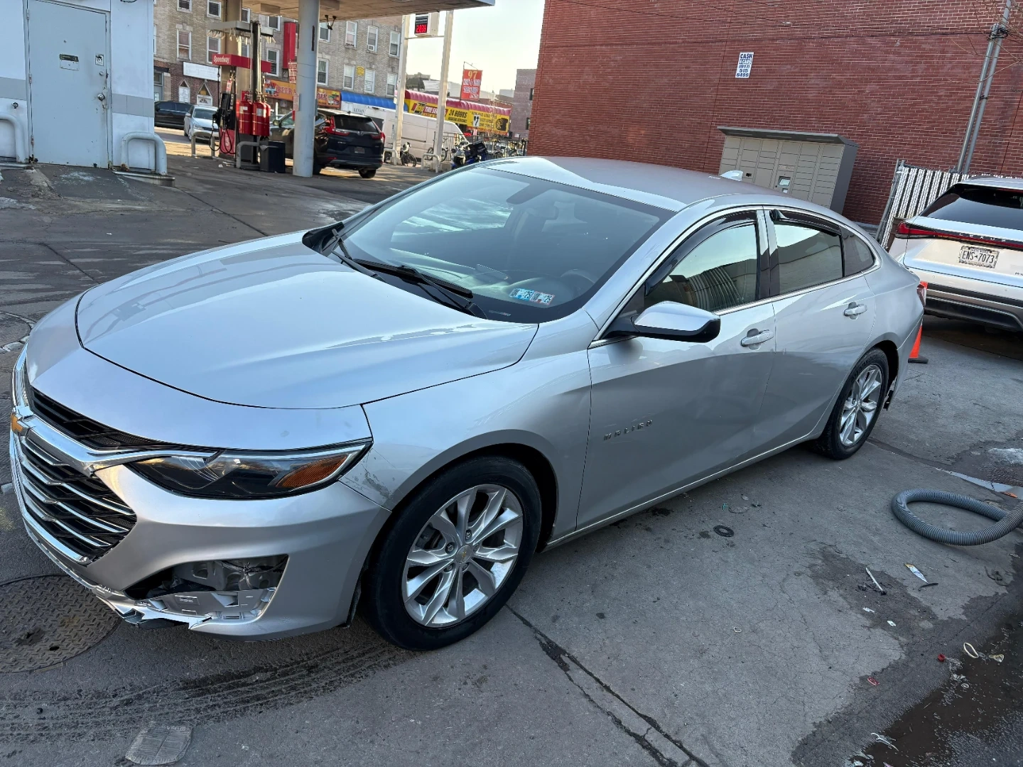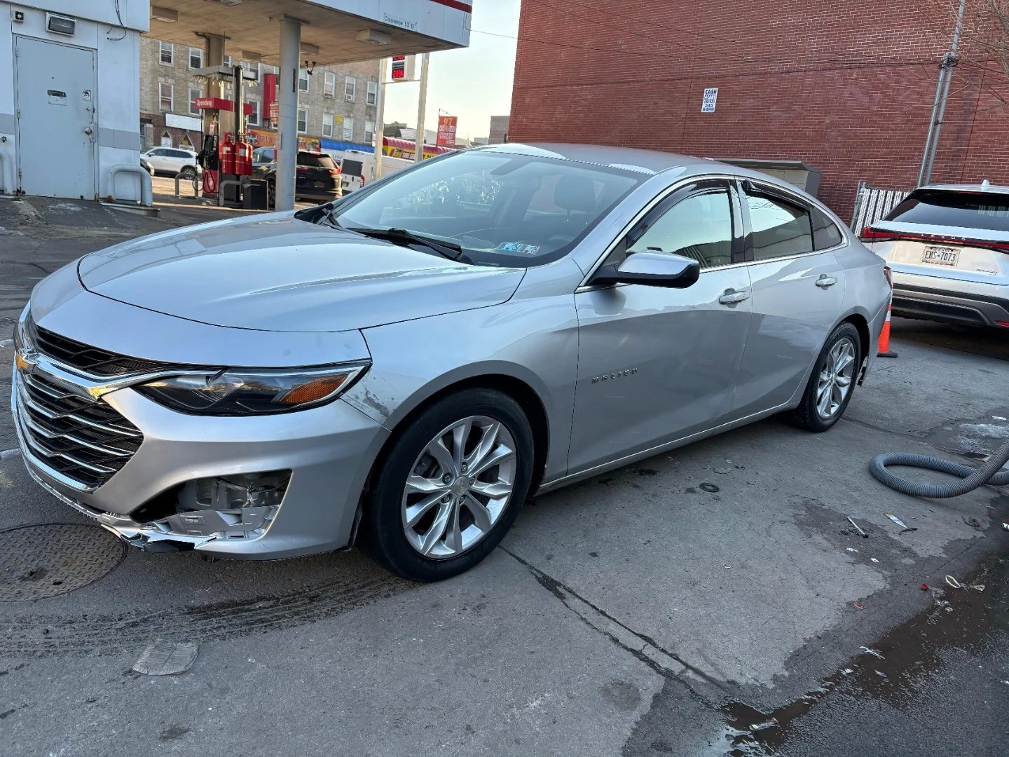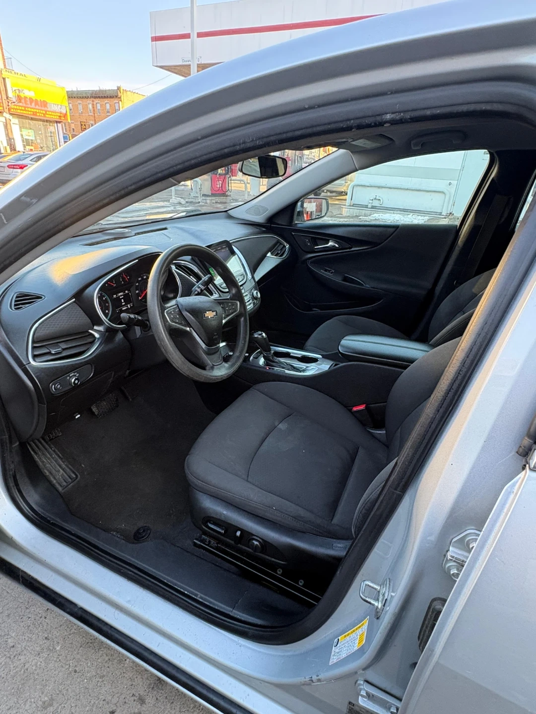 This is a silver Chevrolet Malibu LT sedan. It has black cloth interior. The exterior shows some damage to the front bumper area.