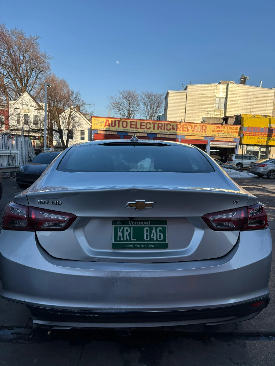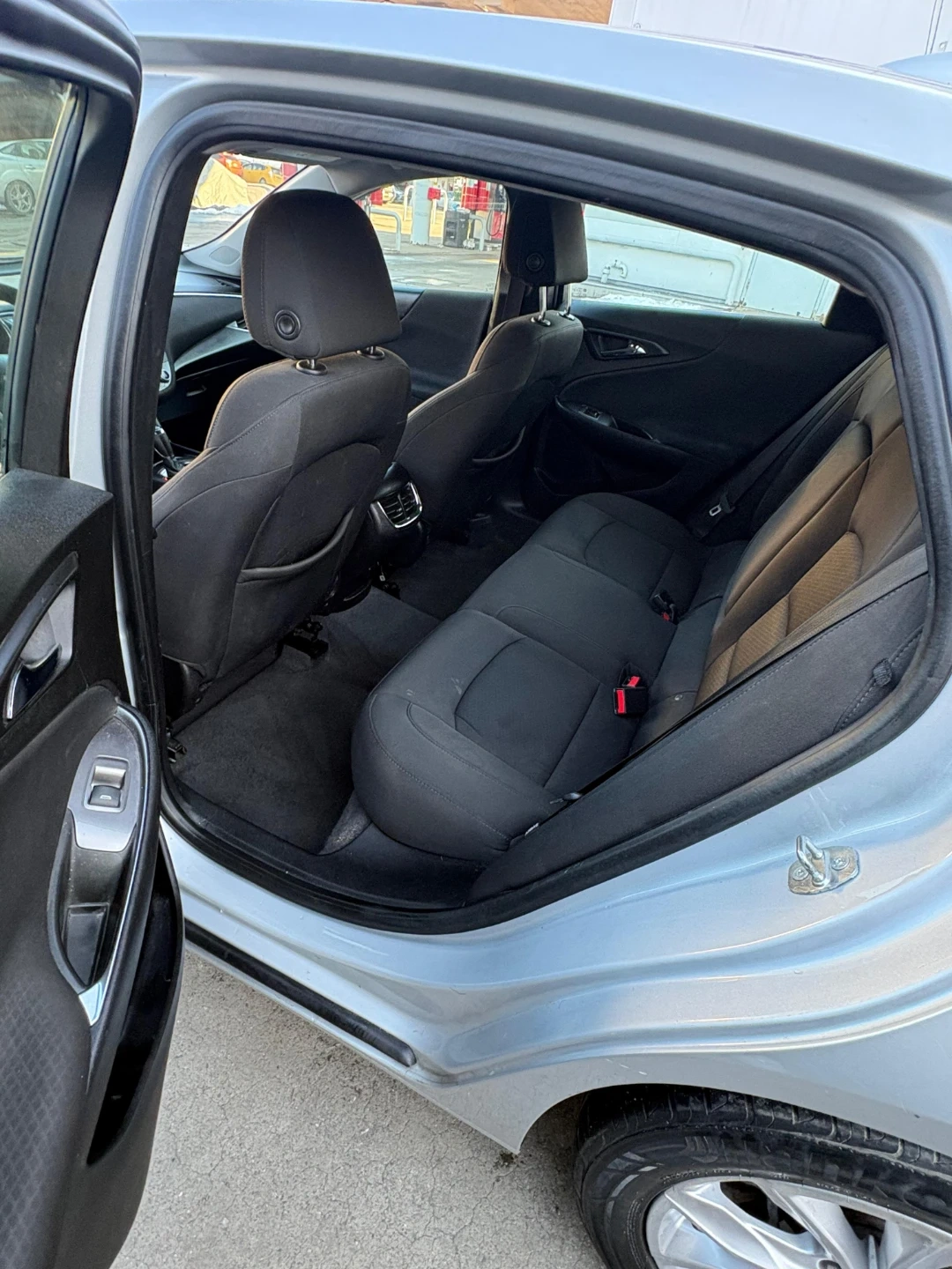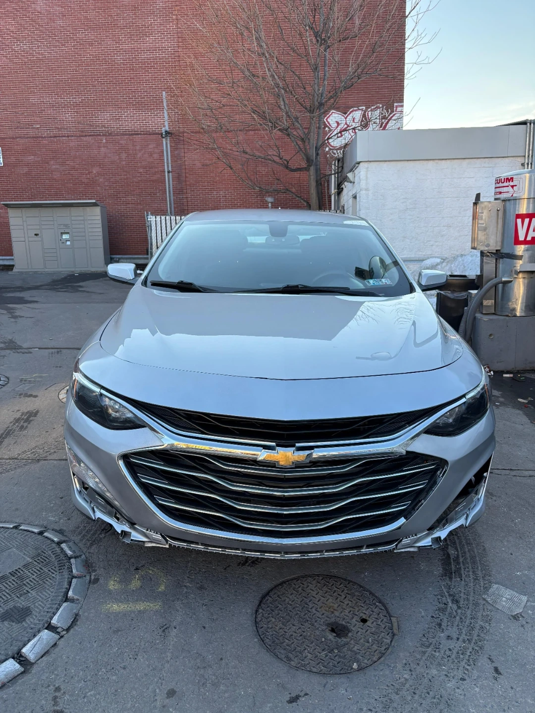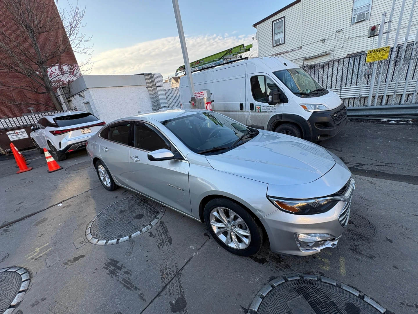 This is a silver Chevrolet Malibu LT sedan. It has black cloth interior. The exterior shows some damage to the front bumper area.