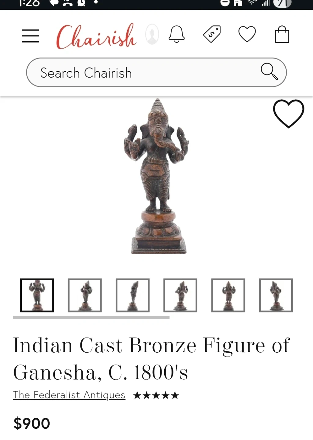 This is an antique Indian cast bronze figure of Ganesha. It's made using the lost wax casting method. Approximately 5-3/4 inches high. The condition is very good original with wear consistent with age and use.