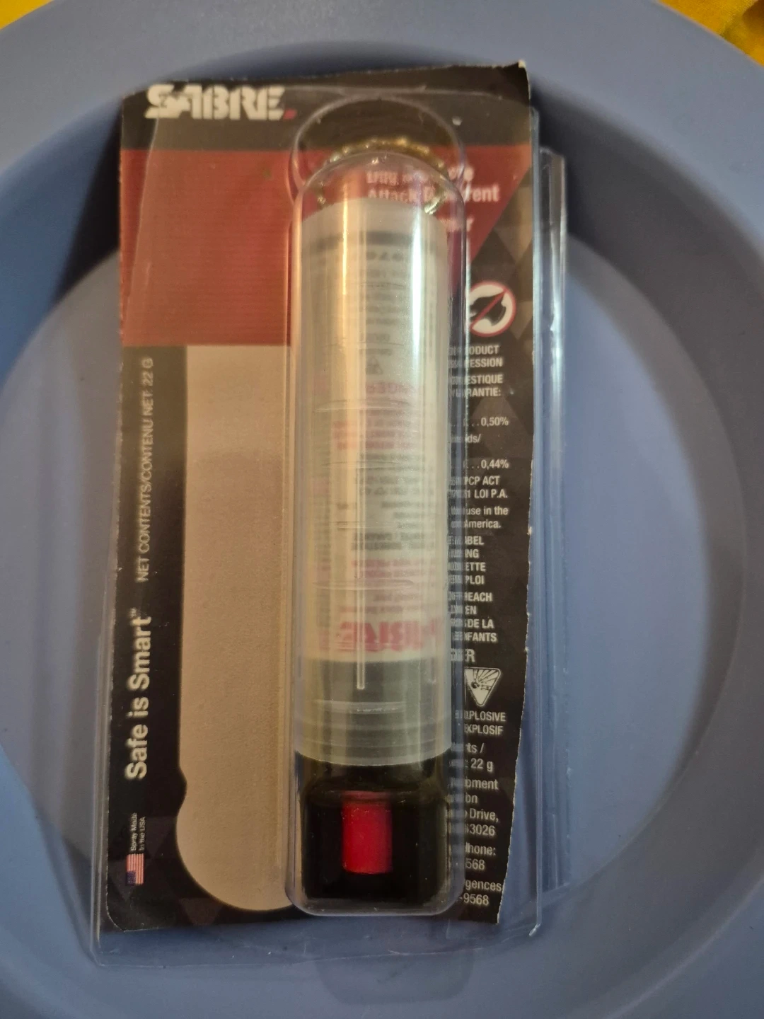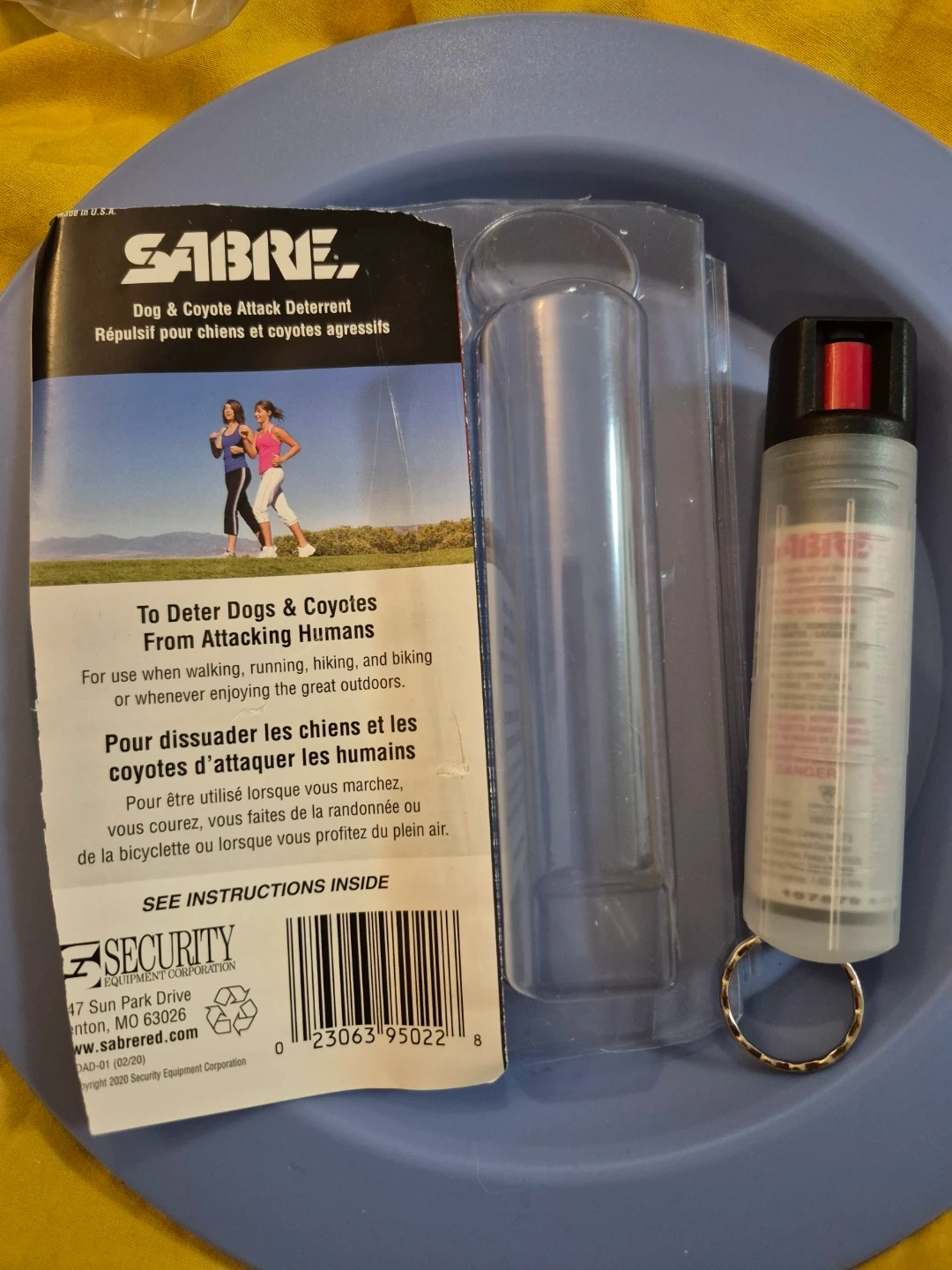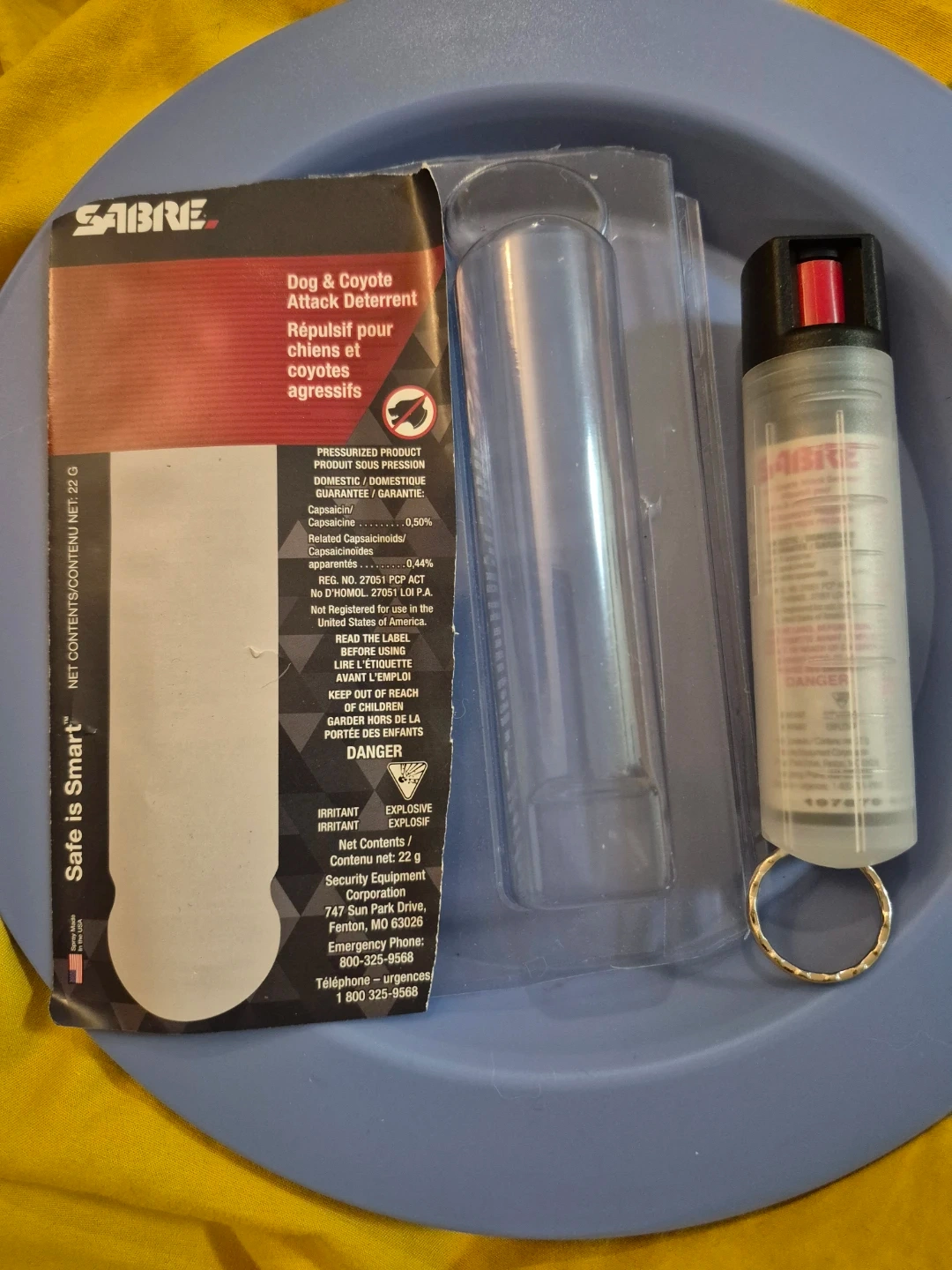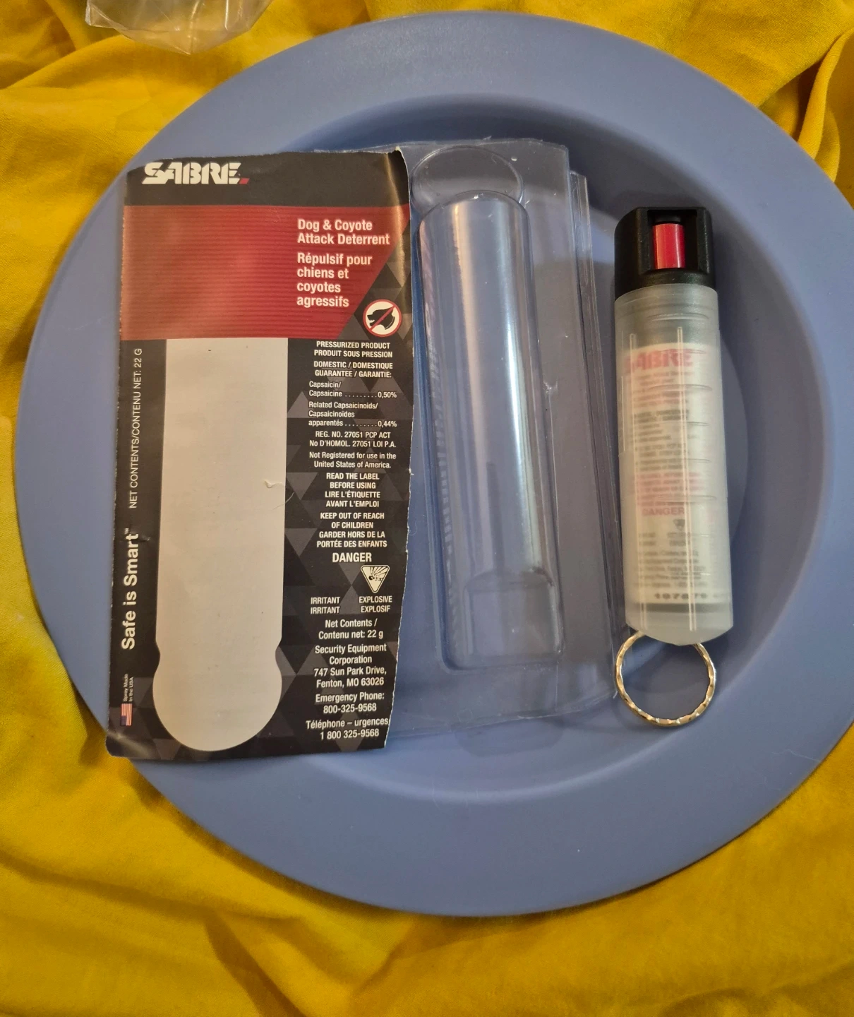 Sabre Dog & Coyote Attack Deterrent spray. Includes a protective holster with a keychain attachment. Net contents are 22 g.
