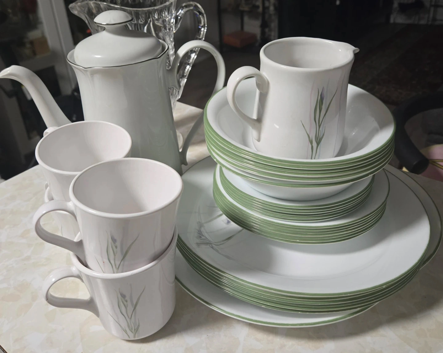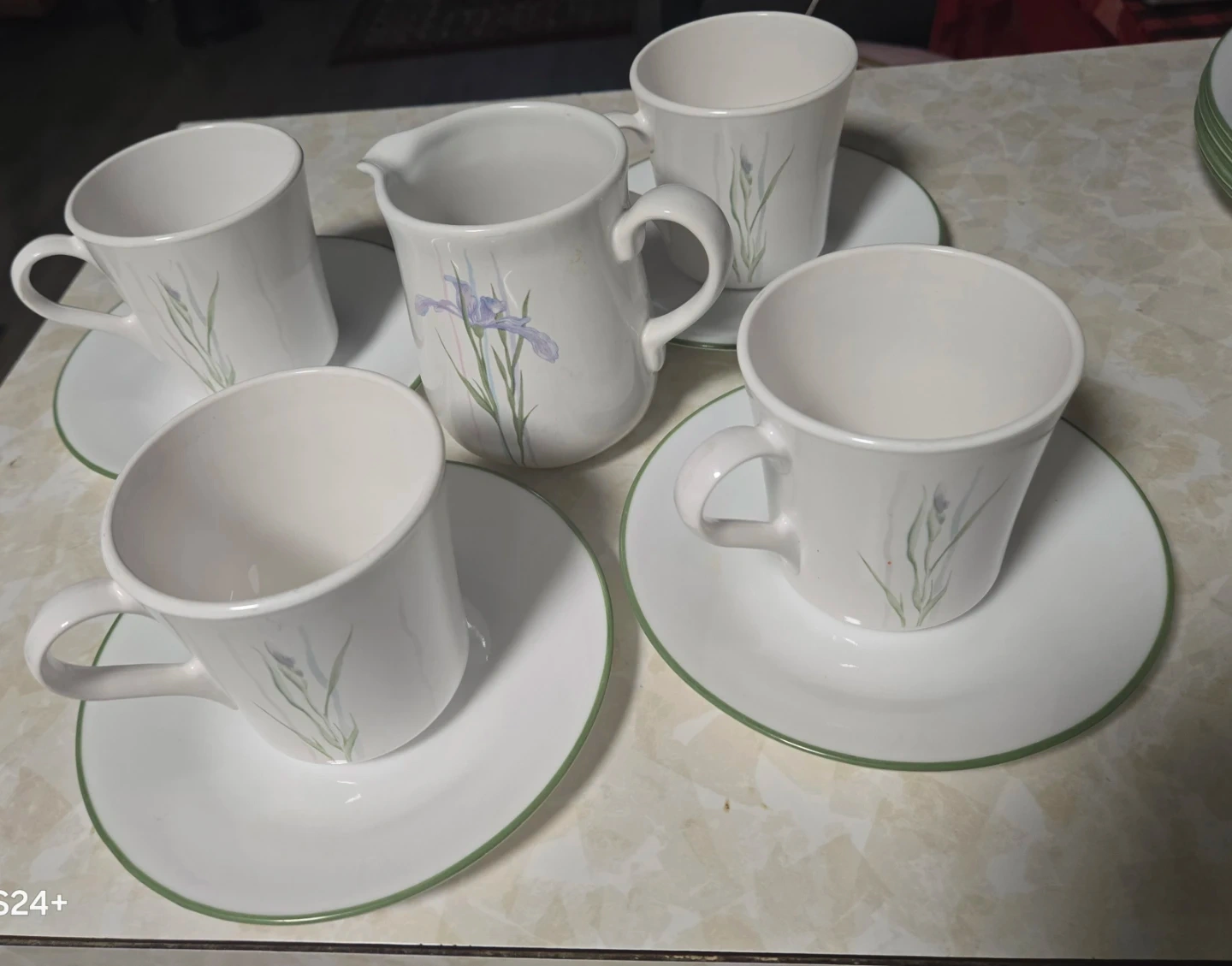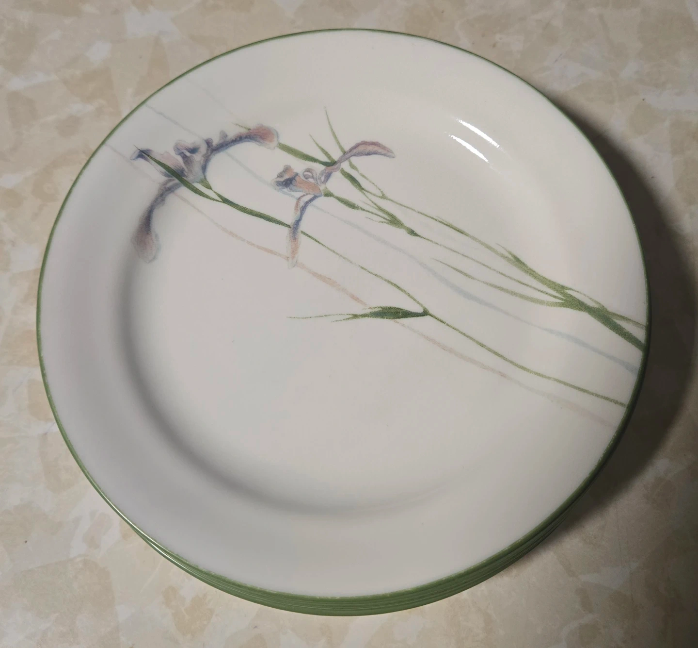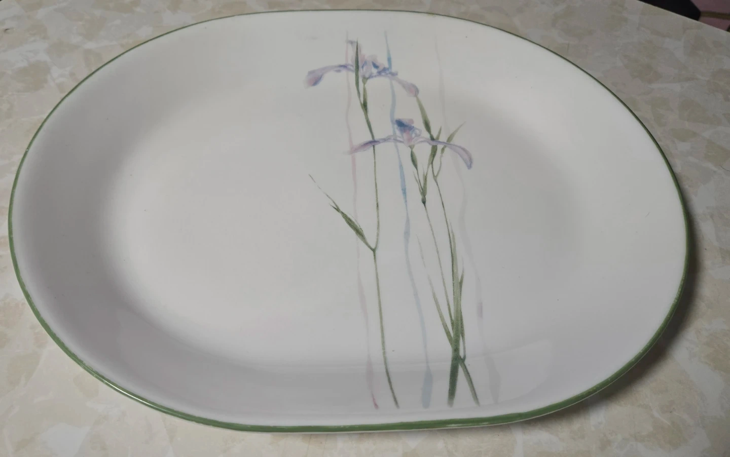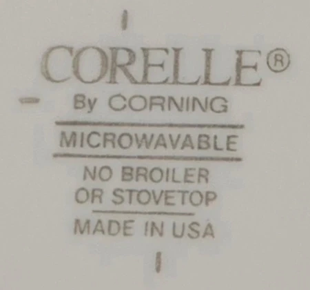 This is a Corelle by Corning dinnerware set featuring an "Iris" floral design. It's microwaveable but not for broiler or stovetop use. Made in the USA. Offers aceptable