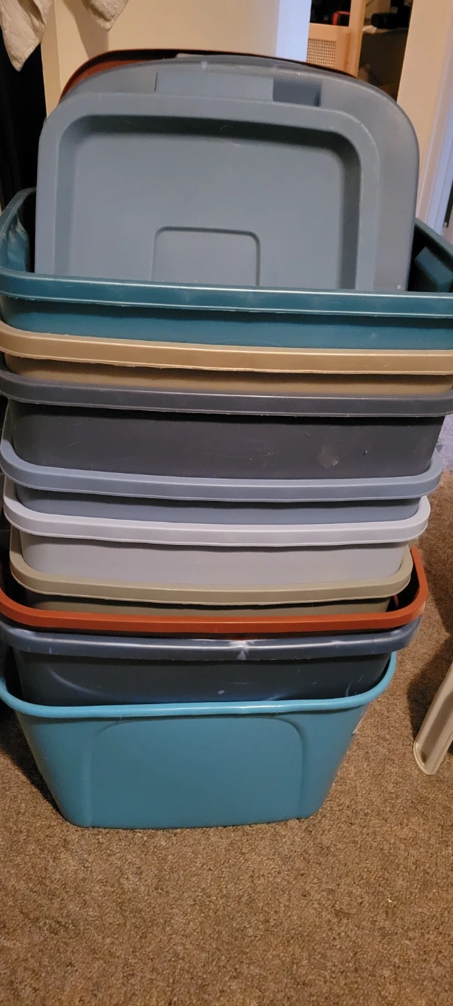 Bundle 4+1big one left ( sold 7) of plastic storage totes with lids. Various sizes and colours are included. These containers are great for organizing. $5 a tote $10 for a big one prices are fixed open for offers if buy them all 10.thanks for watching pickup Capilano Area Cash only .